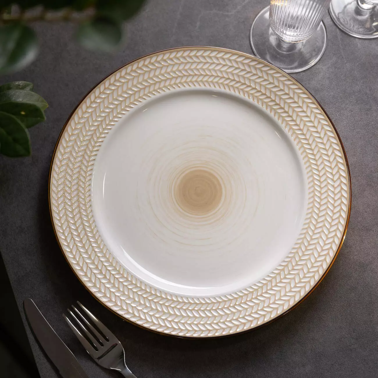 Тарілка має білий колір з легким кремовим відтінком. Її діаметр становить 26 см, а край декорований рельєфним візерунком