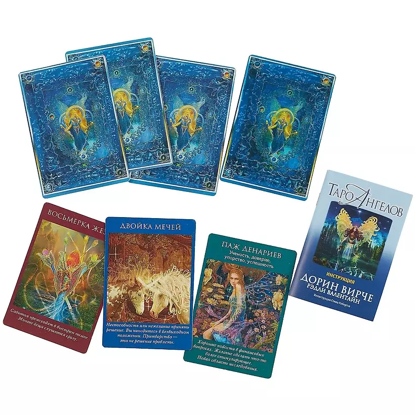 "Таро Ангелов" – это уникальная колода из 78 карт, созданная для мягких, вдохновляющих и позитивных предсказаний. Разработанная Дорин Вирче и Рэдли Валентайном, она сочетает классические элементы Таро с ангельской символикой, делая гадания более доступными и гармоничными.