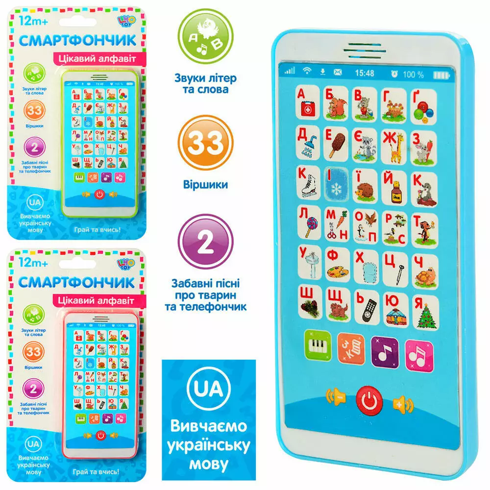 Телефон дитячий цікавий алфавіт KidKod M-3674 українською мовою - це інтерактивний розвиває телефон, який дозволить вашому малюку вивчити свої перші слова, запам'ятати назви предметів, прослухати мелодію.Все завдання та ігри на телефоні будуть цікаві дітям дошкільного віку. Відсутність зайвої інформації, додаткових вікон і відволікаючих елементів дозволяють малюкові зосередитися на процесі навчання, детально вивчати всі наявні кнопки і програми. Телефон дитячий цікавий алфавіт KidKod M-3674 українською мовою - призначений для дітей молодшого дошкільного віку. Українською мовою. Дана модель використовує 3 батарейки типу ааа (не йдуть в комплекті). Іграшка містить 34 кнопки (іконки)