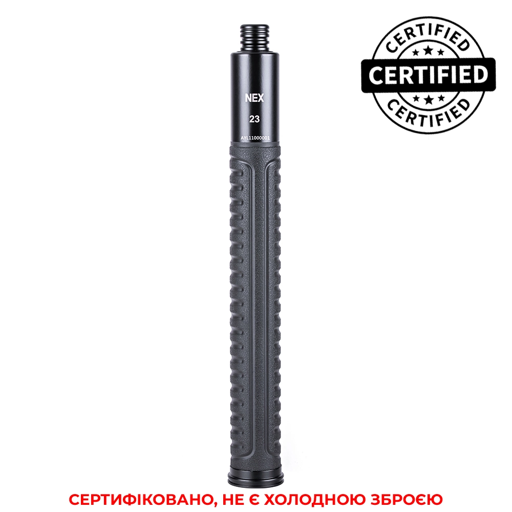 Телескопічна палиця NEX Quicker 23C служить для цілей самозахисту. Стабільна та надійна модель. Відкривається і закривається швидко і без особливих зусиль, проста в обігу. Для виготовлення кийки використовувалися такі матеріали, як легована сталь 42CrMo і аерокосмічний алюміній 7075. Компактна, легка і портативна кийок, наконечник у стані розбивати шибку. Годиться для застосування в екстрених ситуаціях.
