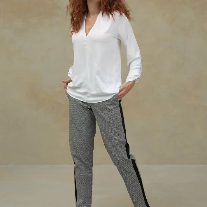 трохи звужені донизу, на широкому поясі. Штани декоровані лампасами