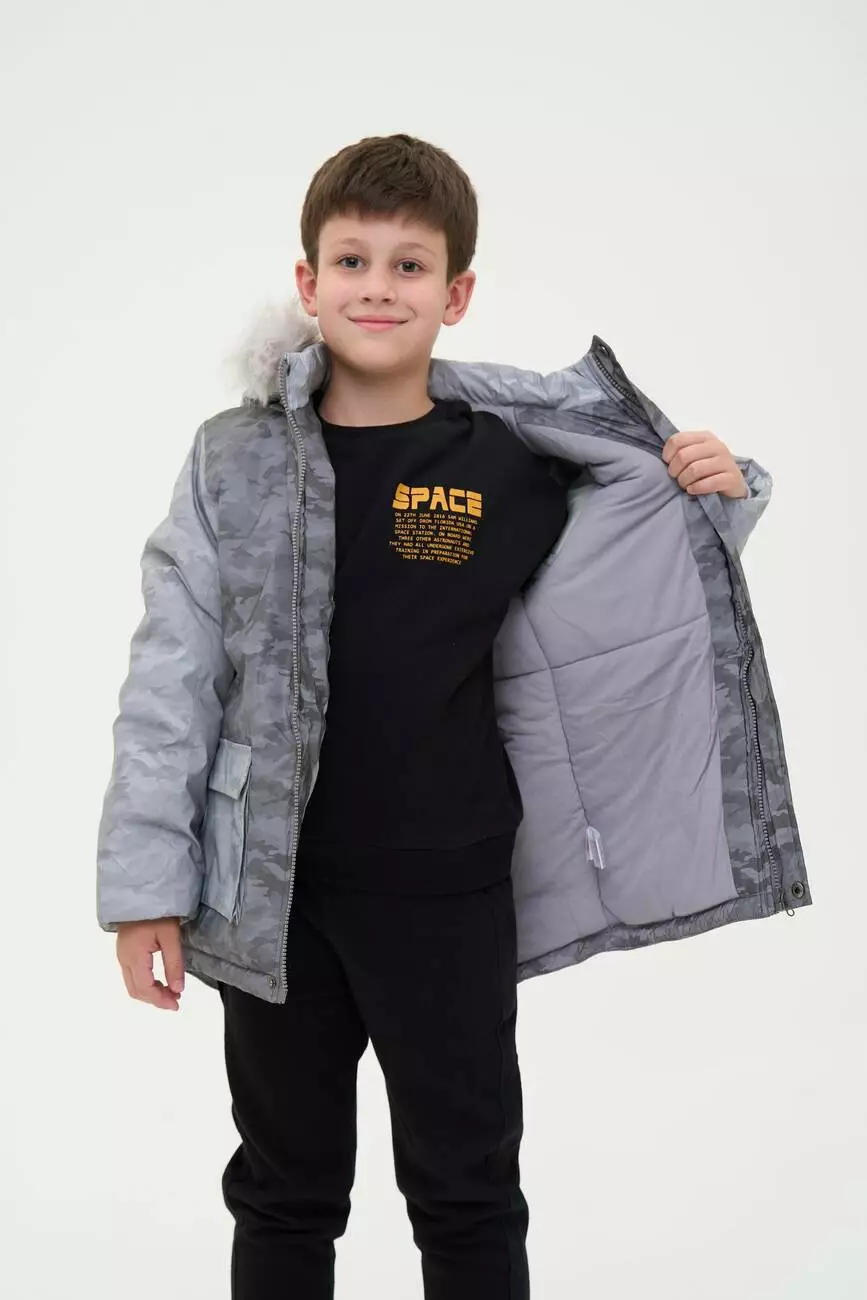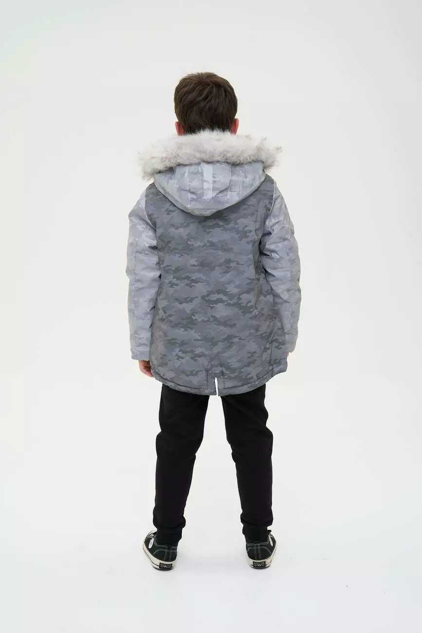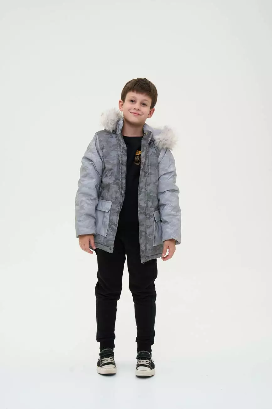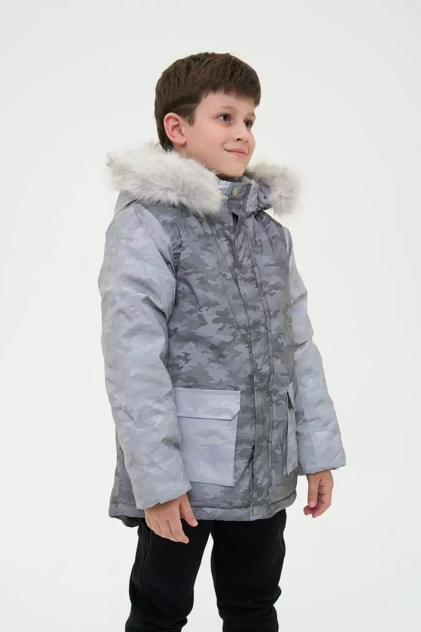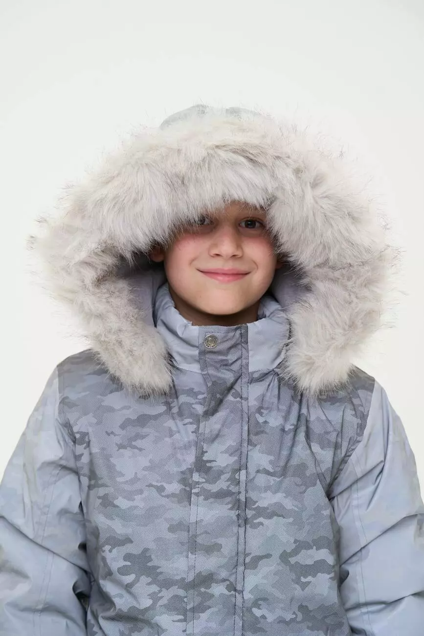 Зустрічайте нову колекцію - колаборація брендів YUMSTER і NEWNESS! Куртка дитяча, тепла з хутряним капюшоном. Стильний дизайн надає образу яскравості. Ідеальний вибір для активних та веселих зимових пригод. Деталі моделі: водонепроникна куртка сірого кольору. Глибокий капюшон із хутром. Капюшон відстібний, на блискавці. Комірець стійка. Застібка на блискавці та кнопки. Накладні кишені. Довжина куртки - нижче за пояс. Прямий крій. Камуфляжний принт. Матеріал верху – мікрофібра. Розмірний ряд: на зріст від 98 см до 140 см