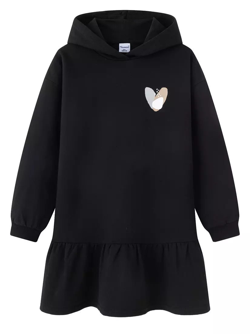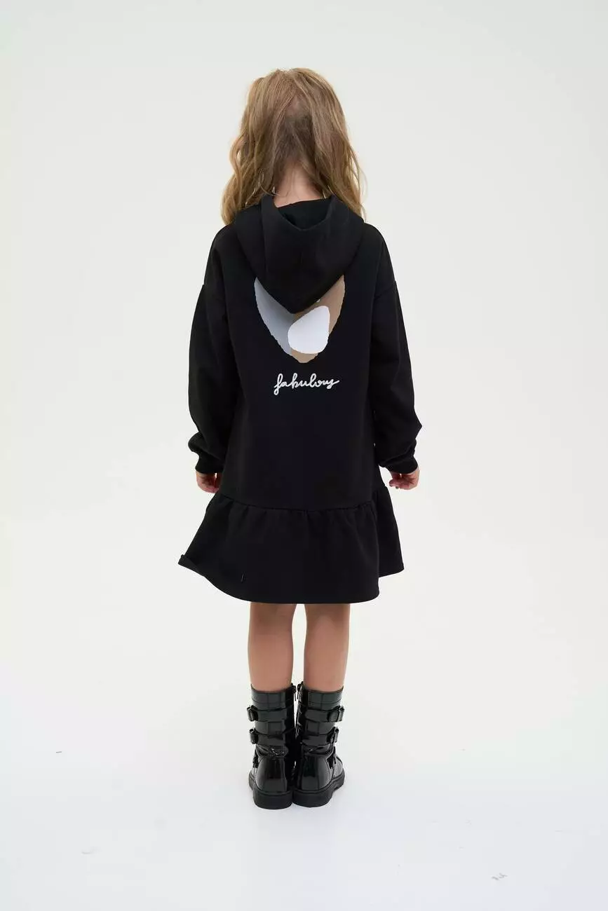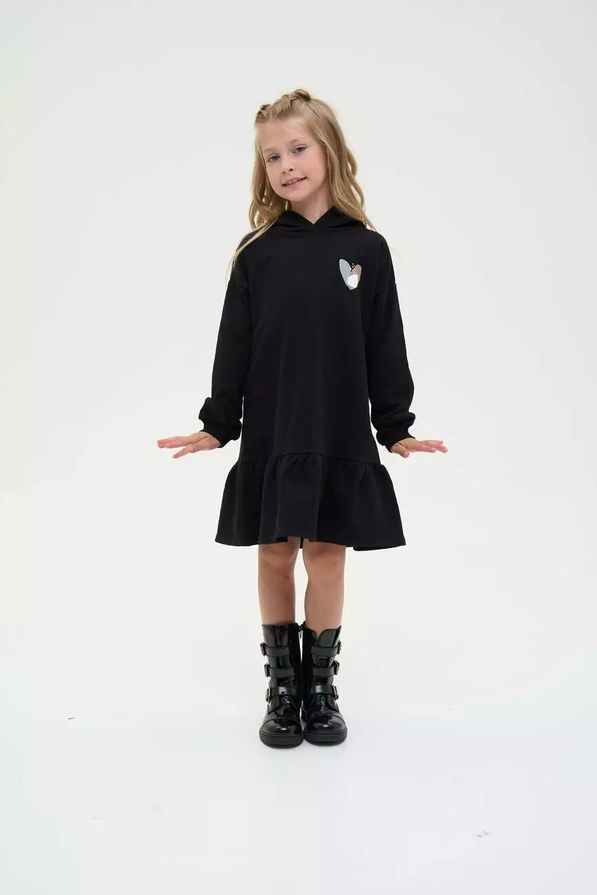 Зустрічайте нову колекцію - колаборація брендів YUMSTER і NEWNESS! Сукня чорна з довгим рукавом та капюшоном - чудовий елемент базового гардеробу. Деталі моделі: сукня чорного кольору. Глибокий каптур. Довгий рукав із манжетами з еластичної резинки. Занижена лінія плеча. Спереду та ззаду є прин. Сукня прямого крою. Низька талія. Спідниця на збірці. Довжина – до колін. Тканина – джерсі, всередині з начосом. Розмірний ряд: на зріст від 128 см до 164 см