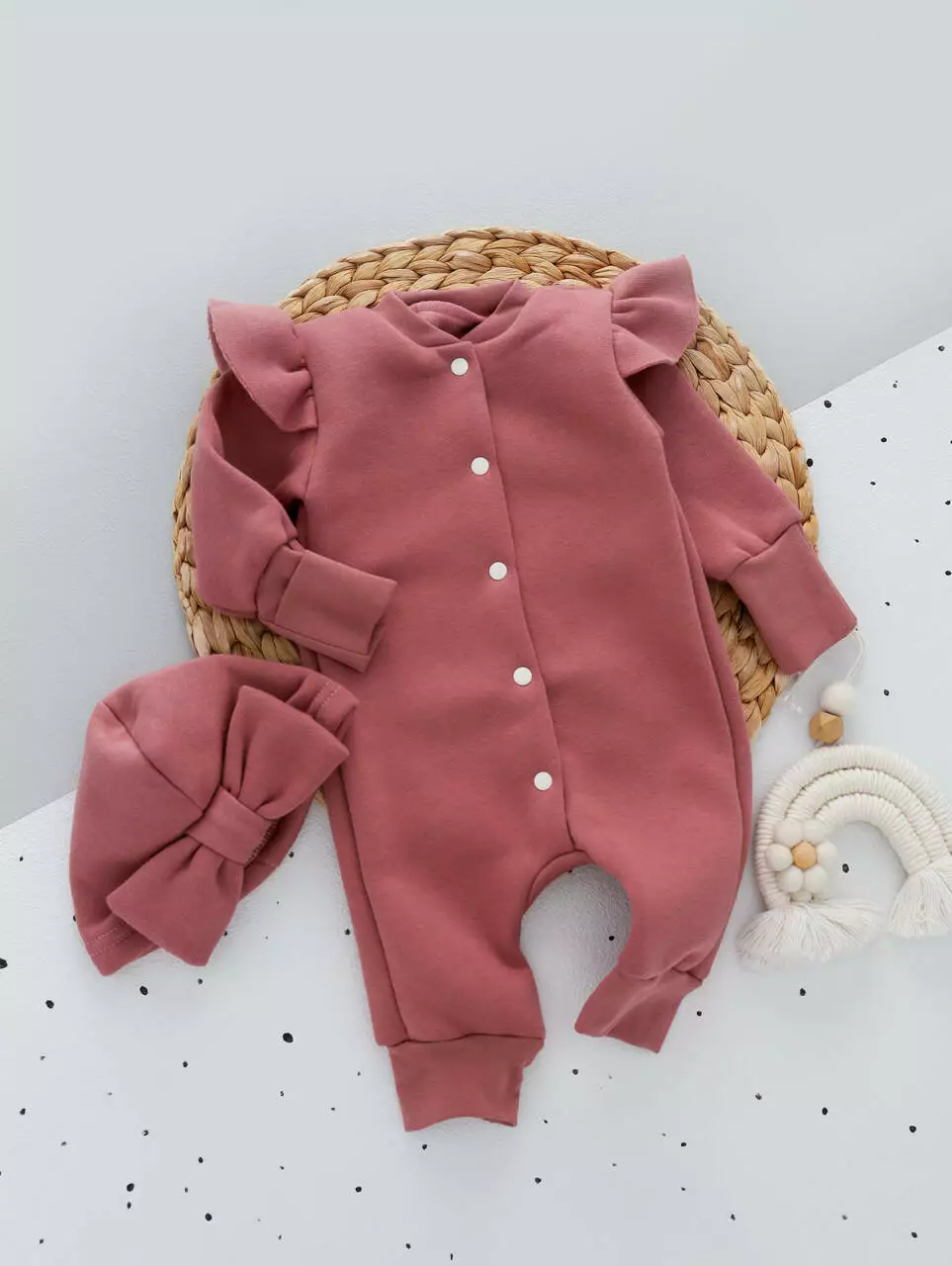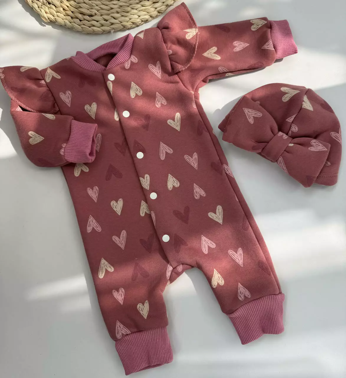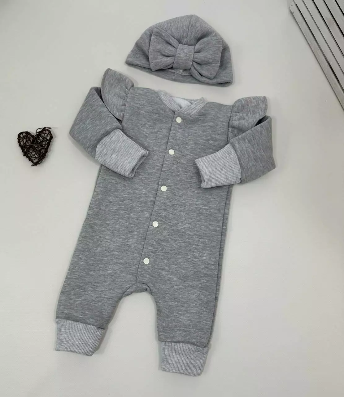 Этот тёплый комплект для малышки выполнен из мягкой и плотной ткани