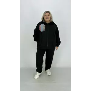 Спортивний костюм з еластичного трикотажу дайвінг, з начосом. Тканина дуже добре тягнеться, м'яка та приємна до тіла, тепла, не кашлатиться, не потребує особливого догляду. Кофта - подовжена з поясом, закриває стегна, внутрішні кишені від бокового шва. Оздоблена якісним накатом, фарба + каміння. Штани з високою посадкою, пояс на резинці, з кишенями дуже зручні.
