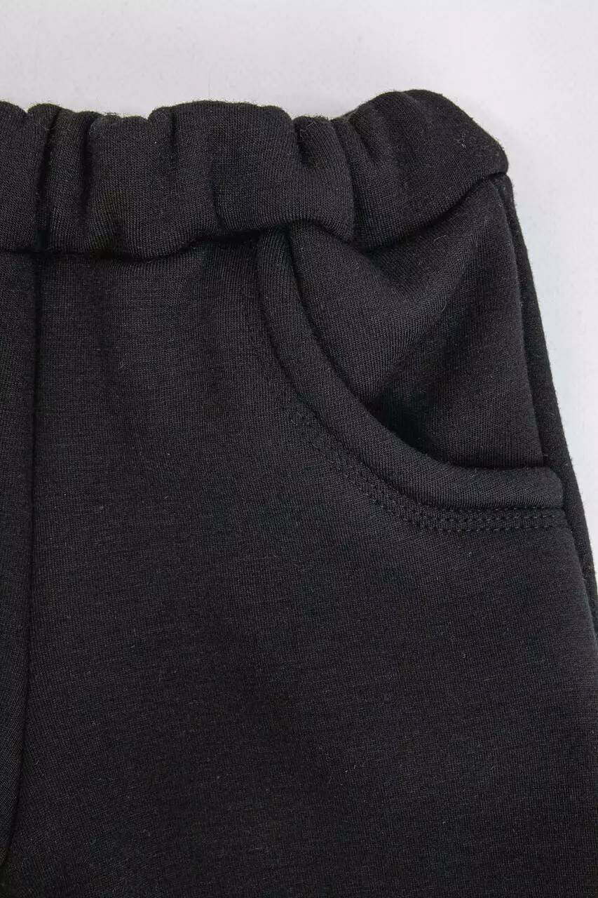 Брюки имеют карманы, а по низу украшены трикотажным манжетом.