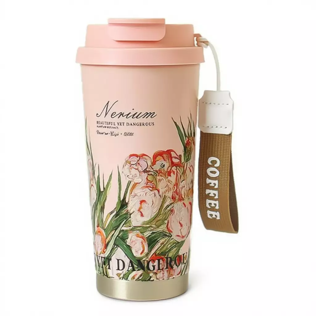 Термочашка 520 мл поєднує функціональність і продуману конструкцію для щоденного використання. На корпусі розміщений квітковий принт із написом. Модель оснащена герметичною кришкою з подвійним відкриванням: окремий клапан для пиття та додатковий отвір для використання трубочки. Збоку закріплений текстильний ремінець із написом “COFFEE”.
