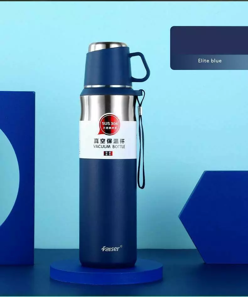 Термос 600 мл з чашкою і ремінцем, синій