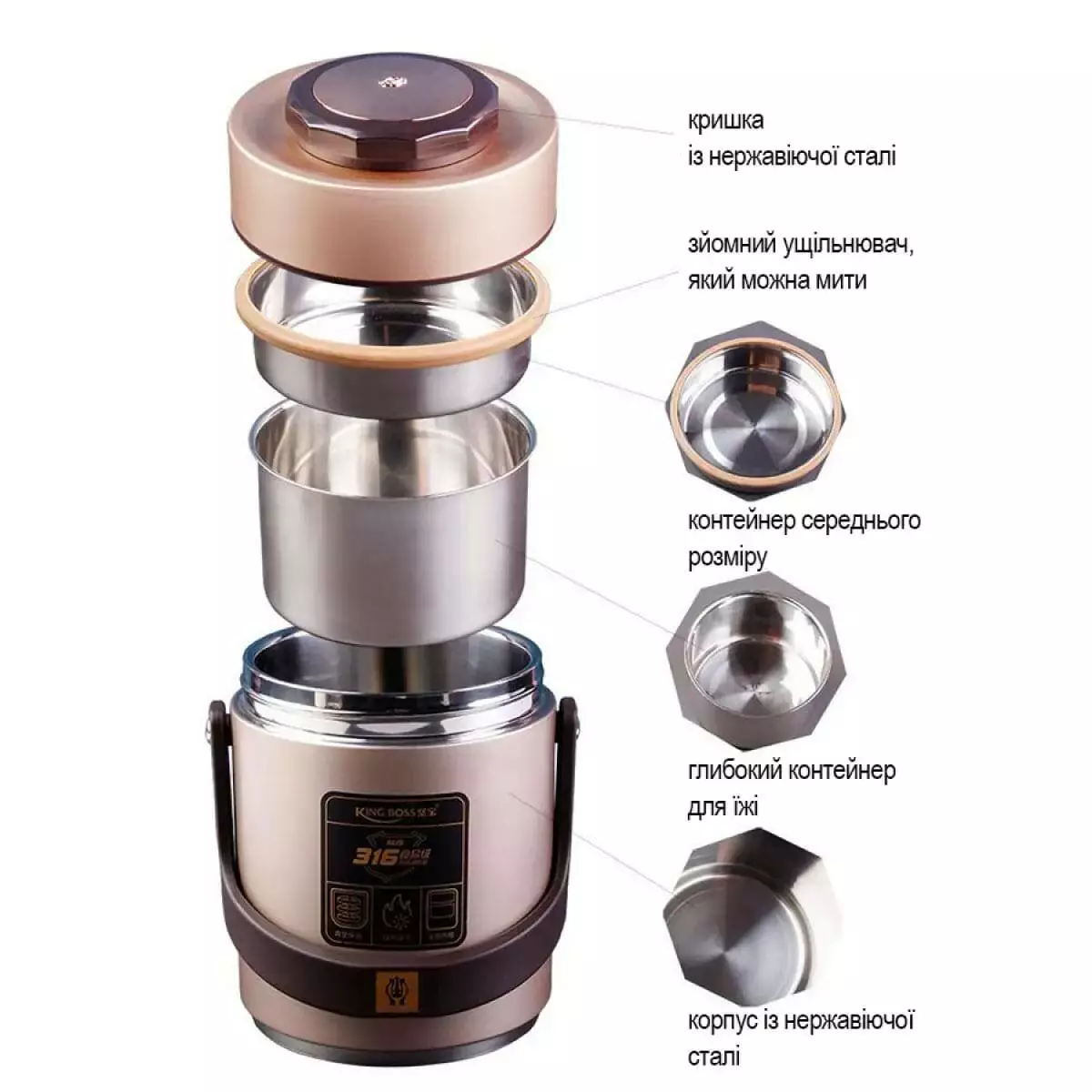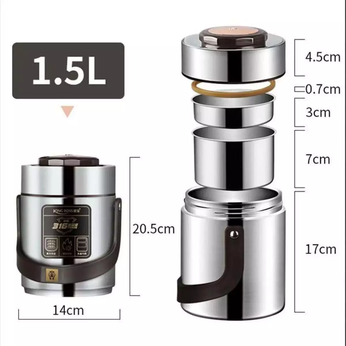 Термос для їжі King Boss 1,5 л з двома контейнерами з нержавіючої сталі – незамінна річ для пікніків та подорожей, в офісі та під час поїздок з дітьми, коли хочеться мати під рукою порцію гарячого ароматного супу чи інших страв. Цей термос виготовлений з високоякісної нержавіючої сталі, яка не схильна до корозії та не псує смак їжі. Він має подвійні стінки із вакуумною ізоляцією, що дозволяє зберегти тепло чи холод протягом тривалого часу.
