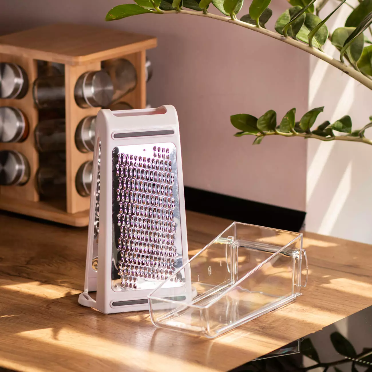 Двостороння тертка з контейнером — функціональний інструмент для швидкого та чистого подрібнення продуктів на кухні. Завдяки двом типам лез вона дозволяє натирати інгредієнти як на великі, так і на дрібні шматочки. Контейнер кріпиться під робочою частиною та збирає натерті продукти, зменшуючи кількість крихт і зберігаючи порядок на поверхні.