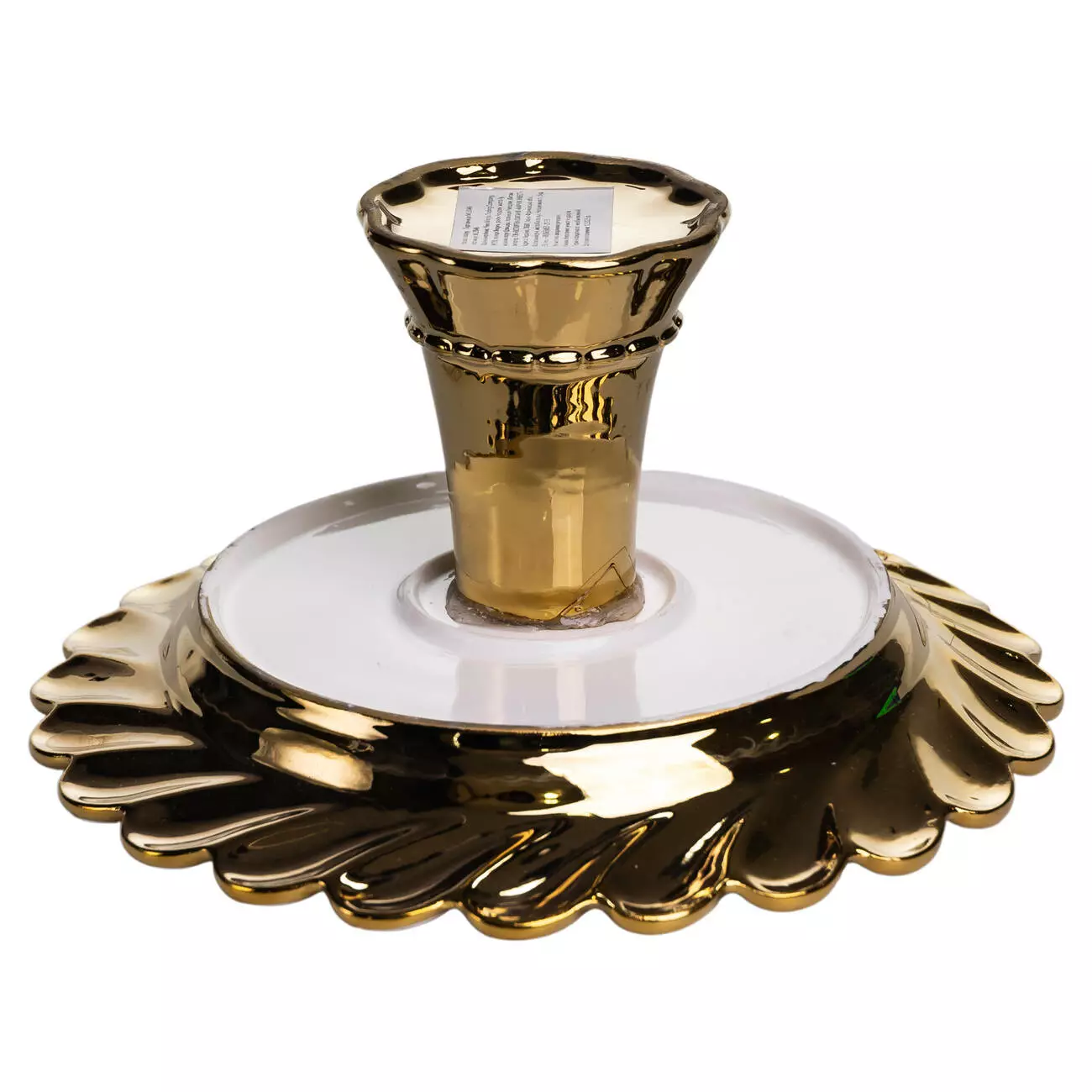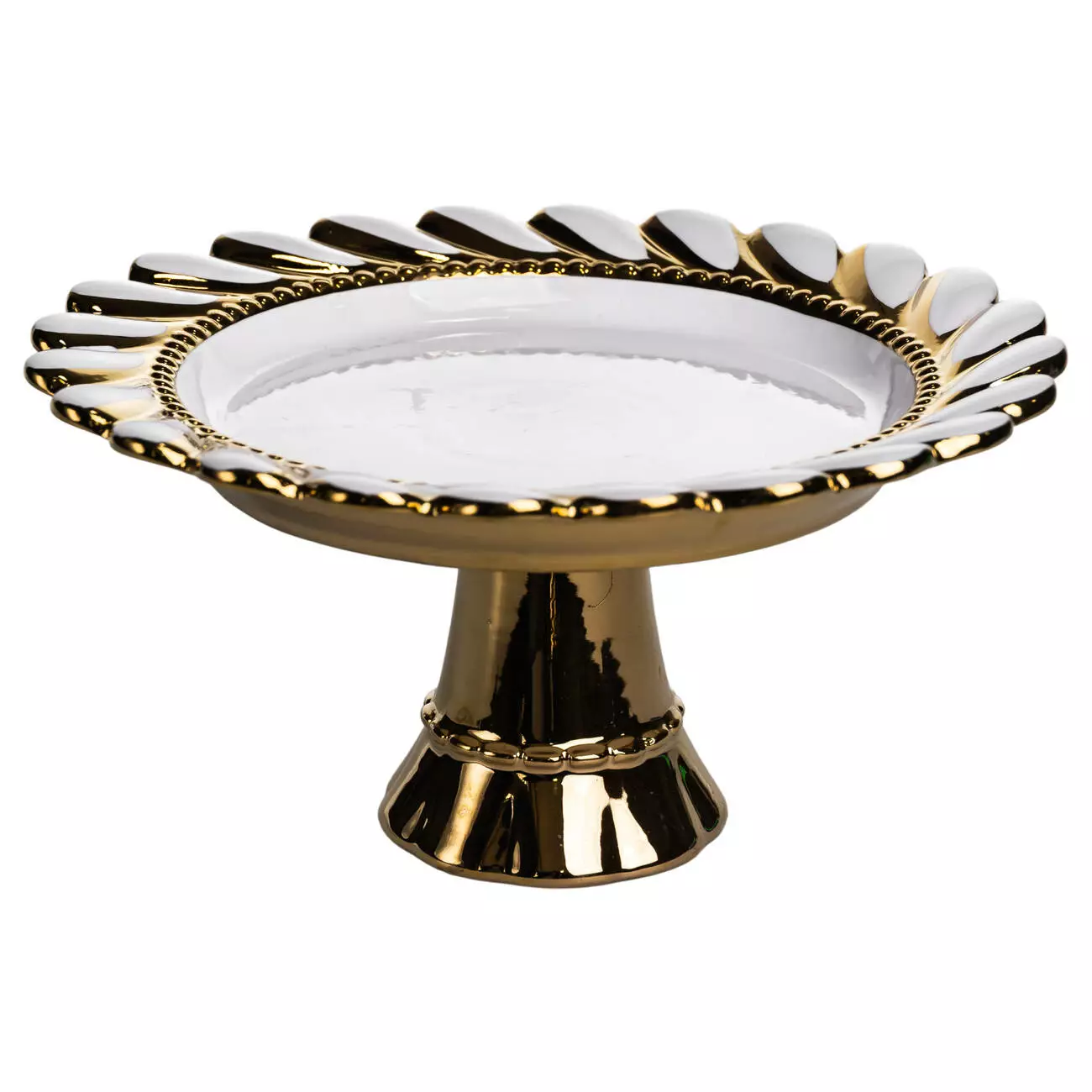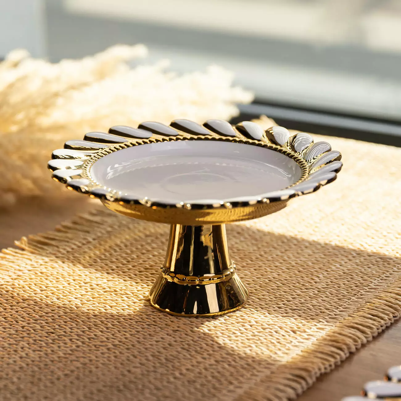 Ніжка виконана в золотому кольорі, має масивну форму з плавним розширенням донизу, що забезпечує стійкість конструкції. Поєднання порцелянової тарілки та металевої основи формує збалансований вигляд, який можна поєднувати з іншим посудом або використовувати як окремий елемент сервірування.