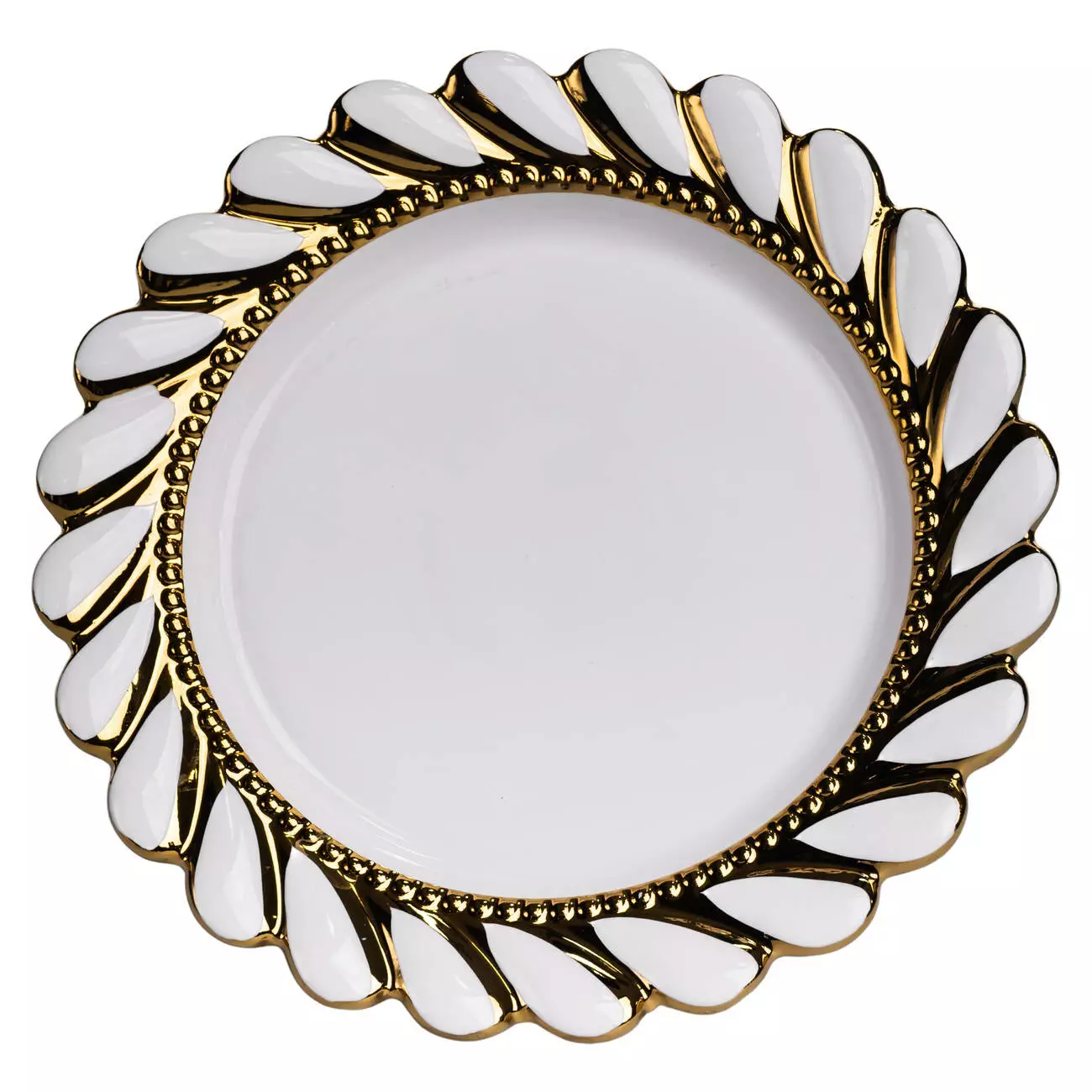 Основа виготовлена з порцеляни з гладкою поверхнею, що не вбирає запахи та легко очищується. По краю розташований декоративний обідок із рельєфним візерунком у вигляді дрібних елементів, що нагадують намистини або листя. Тонка золота окантовка підкреслює форму виробу та створює чіткий контур без надмірного акцентування.