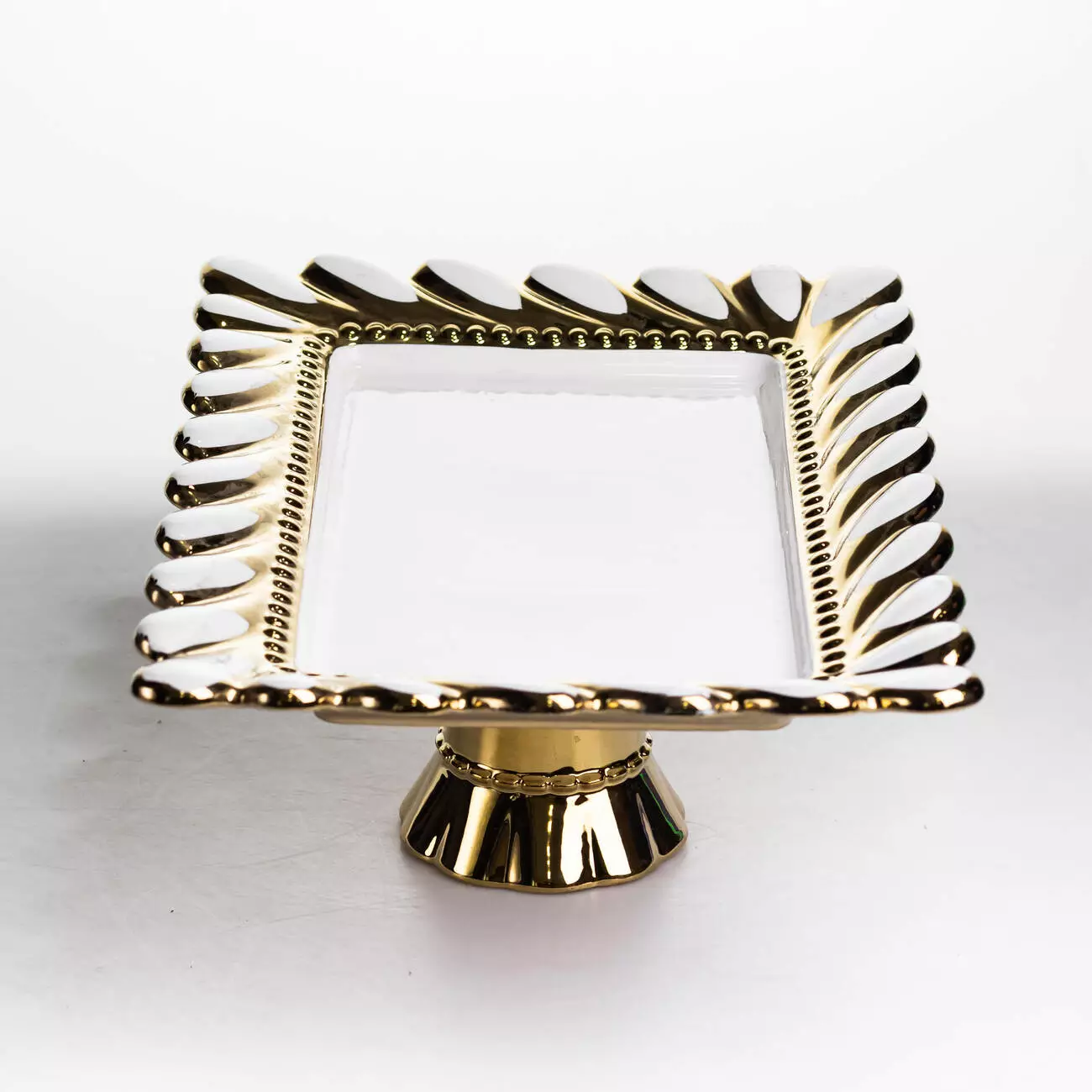 Ніжка виконана в золотому кольорі, має масивну форму з плавним розширенням донизу, що забезпечує стійкість конструкції. Поєднання порцелянової тарілки та металевої основи формує збалансований вигляд, який можна поєднувати з іншим посудом або використовувати як окремий елемент сервірування.