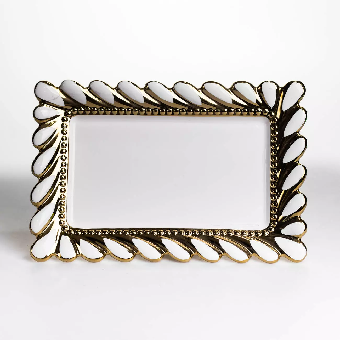 Основа виготовлена з порцеляни з гладкою поверхнею, що не вбирає запахи та легко очищується. По краю розташований декоративний обідок із рельєфним візерунком у вигляді дрібних елементів, що нагадують намистини або листя. Тонка золота окантовка підкреслює форму виробу та створює чіткий контур без надмірного акцентування.