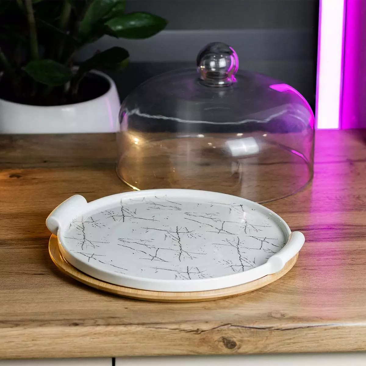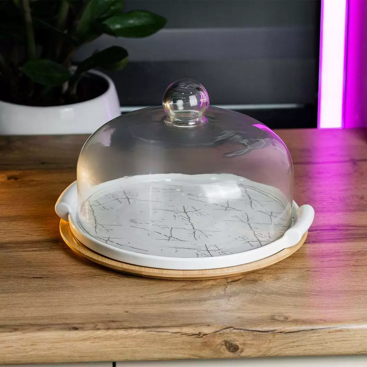 Скляна кришка, яка йде в комплекті, надійно захищає ваші кулінарні шедеври від зовнішніх впливів, зберігаючи їхню свіжість та смак. Прозоре скло кришки дозволяє милуватися красою десерту, не знімаючи кришки, що додає елементу загадковості та очікування на кожному святковому заході.