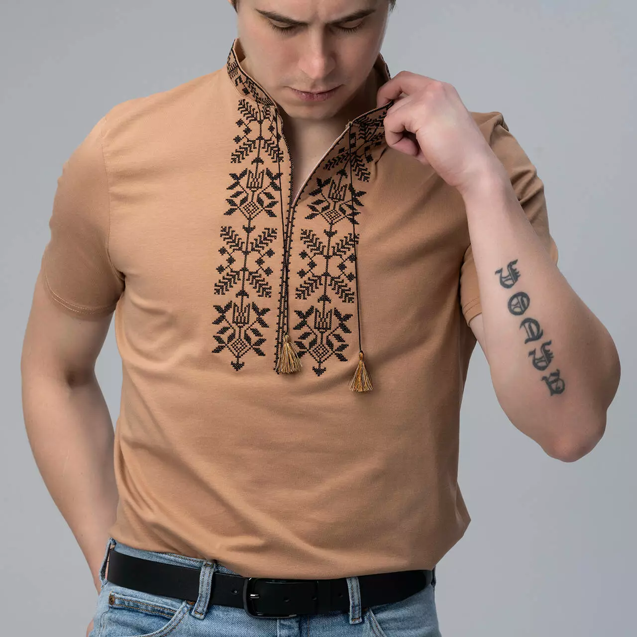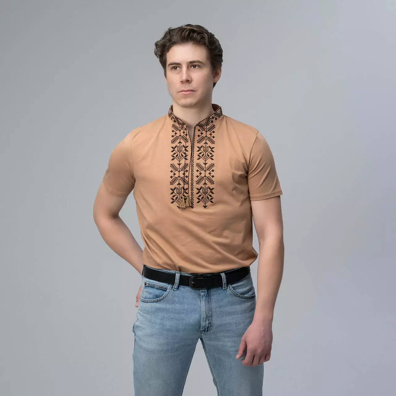 Бежева чоловіча футболка з вишивкою "Тризуб" - це модель, яка здивує вас своїм кольором. Ви подумаєте, що таого може бути у бежевому кольорі, а відповідь проста, це настільки унікальний бежевий колір, що ви його назавжди запам'ятаєте, і цей колір видно здалеку. На фоні цього кольору красується витончений чорний орнамент.