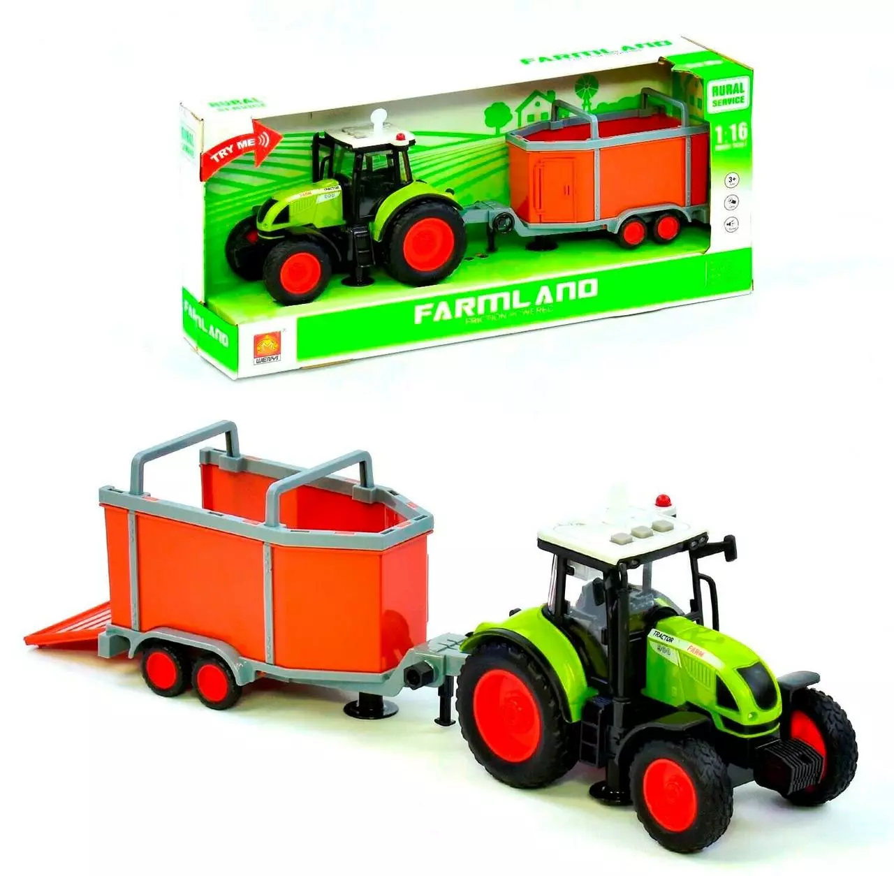 Реалистичные модели спецтехники всегда привлекали мальчишек всех возрастов. Юными исследователями движет интерес узнать, как же работают чудеса современной техники, а докопаться до истины поможет трактор с прицепом. Прекрасно детализированная с масштабом 1:16 модель трактора работает от 3-х батареек типа AG13 (входят в комплект), которые обеспечивают звуковые эффекты (спецсигналы, зажигание, звук мотора) и подсветку фар. Специальный прицеп трактора предназначен для фермерских работ и оснащен подвижными элементами. Трактор оснащен механизмом инерционного движения. Материал: пластик, резиновые колеса.