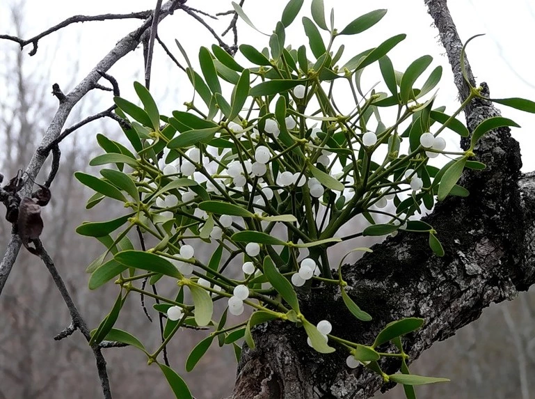 Омела – это многолетнее вечнозеленое растение-паразит, высота которого может варьироваться в пределах от 20 до 120 см. Деревянистые голые ветви легко ломаются. Корни омелы без труда проникают под древесину и кору дерева-хозяина. Бледно-зеленые листья имеют продолговатую форму с параллельным жилкованием. Листья располагаются на ветвях попарно.