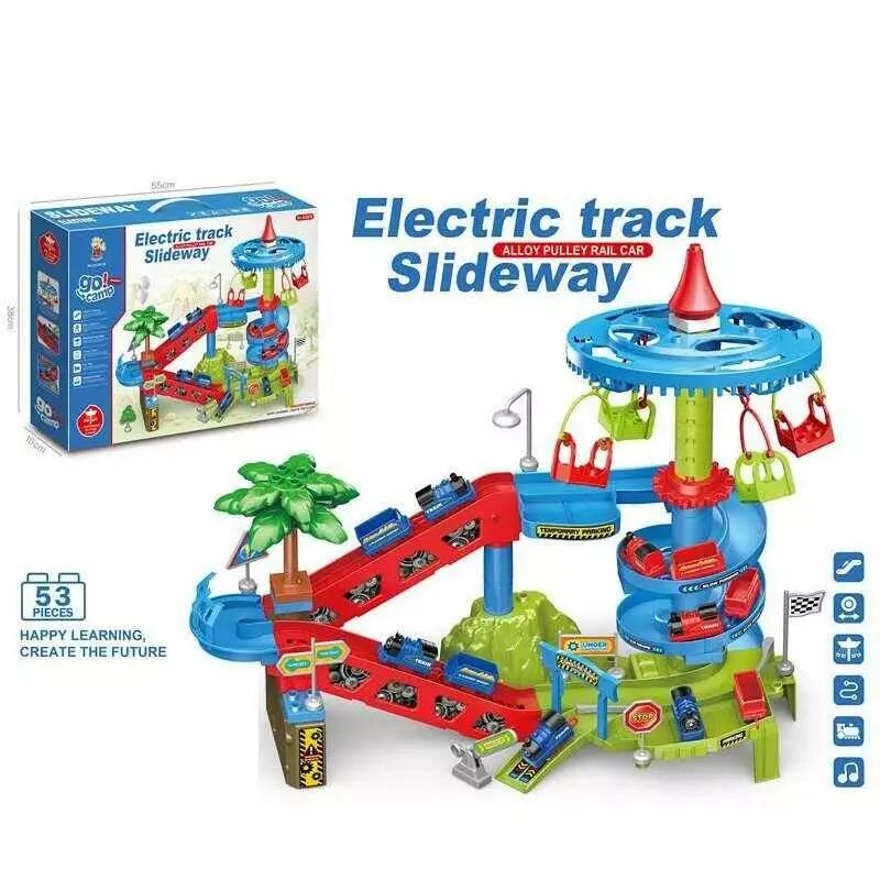 Трек 222 B 139 (12)53 елементи, наліпки, 2 потяги, 2 знімних вагони, рухлива карусель, на батарейках, музика, зміна режимів, автоматичний підіймач, в