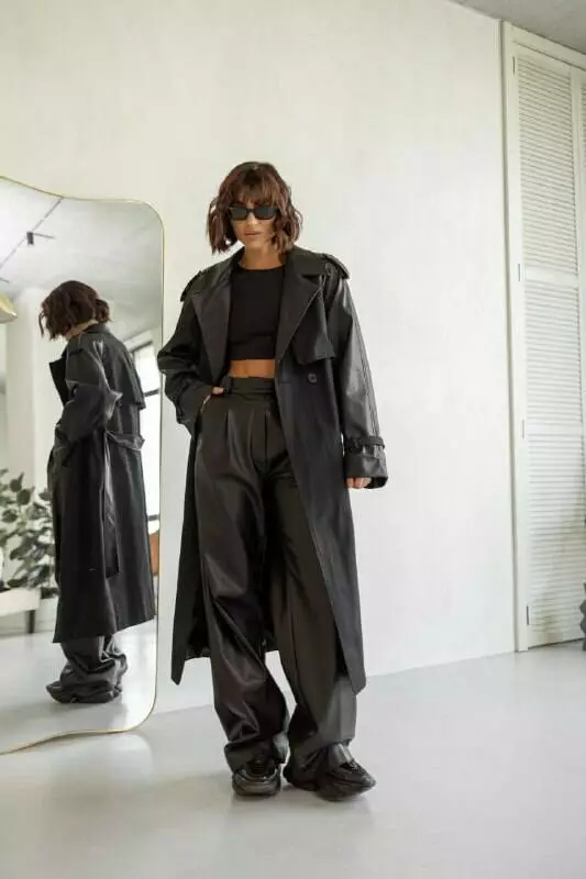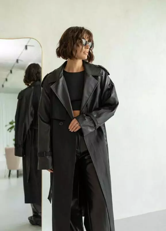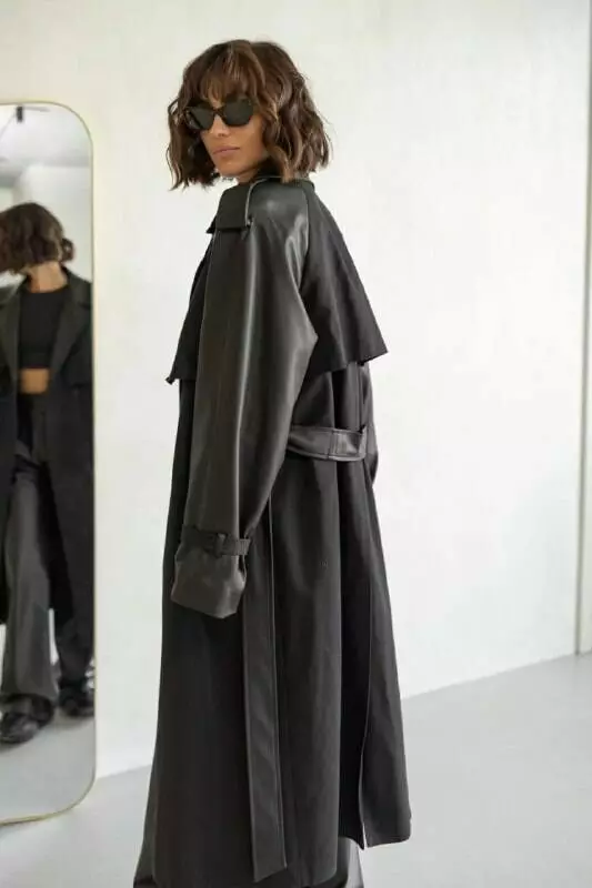Однобортний, комбінований тренч з екошкіри та бавовни, оснащений функціональним розрізом ззаду, застібається на ґудзик та однотонний пояс зі екошкіри, який дозволяє зробити акцент на талії, щоб силует став ще жіночнішим Матеріал: бавовна + екошкіра Розмір: S/L