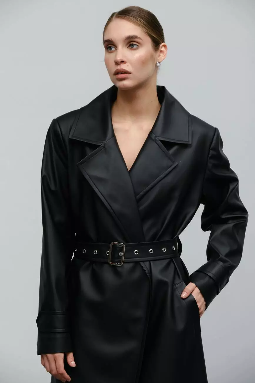 Базовий універсальний тренч з щільної екошкіри, який стане ідеальним верхнім шаром для образу на будь-який сезон. Адже його можна стильно поєднати як з буденним образом з кросівками та джинсами, так і з розкішним вечірнім під підбори.