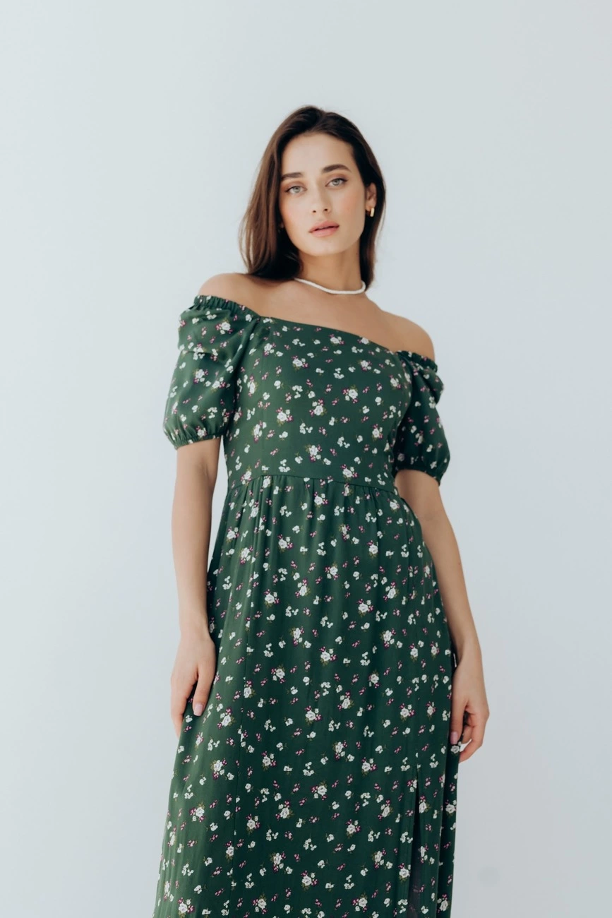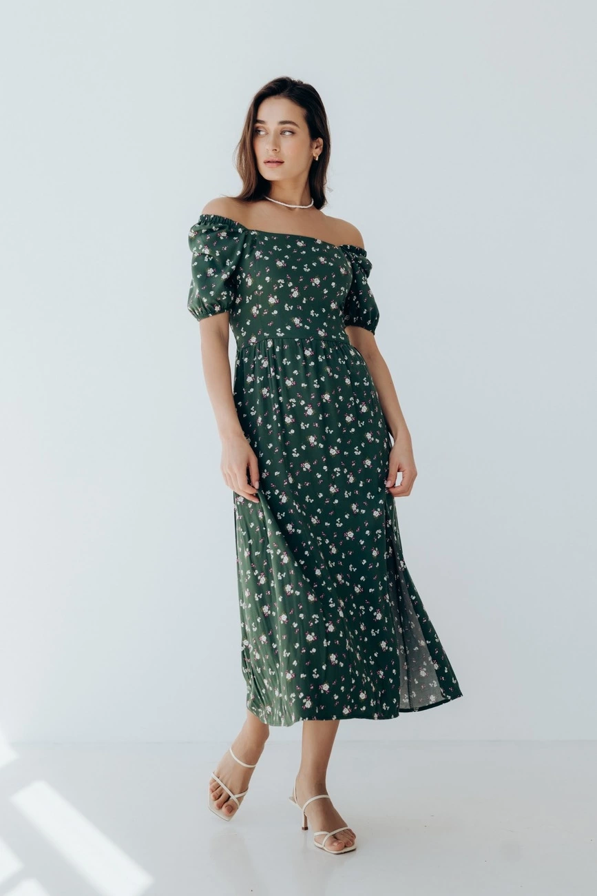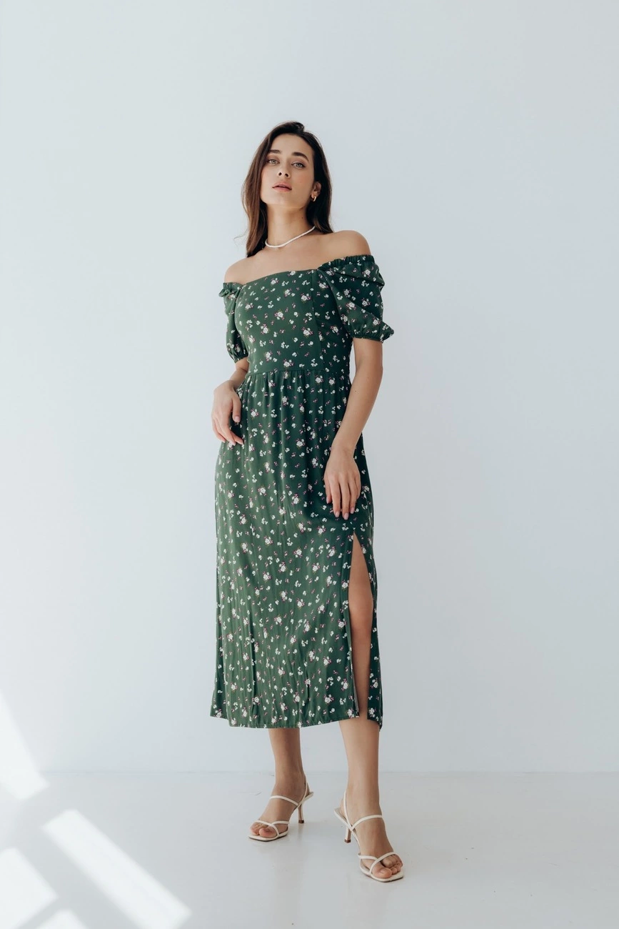 на плечі. Внизу сукня дві розпірки. Міді довжина,