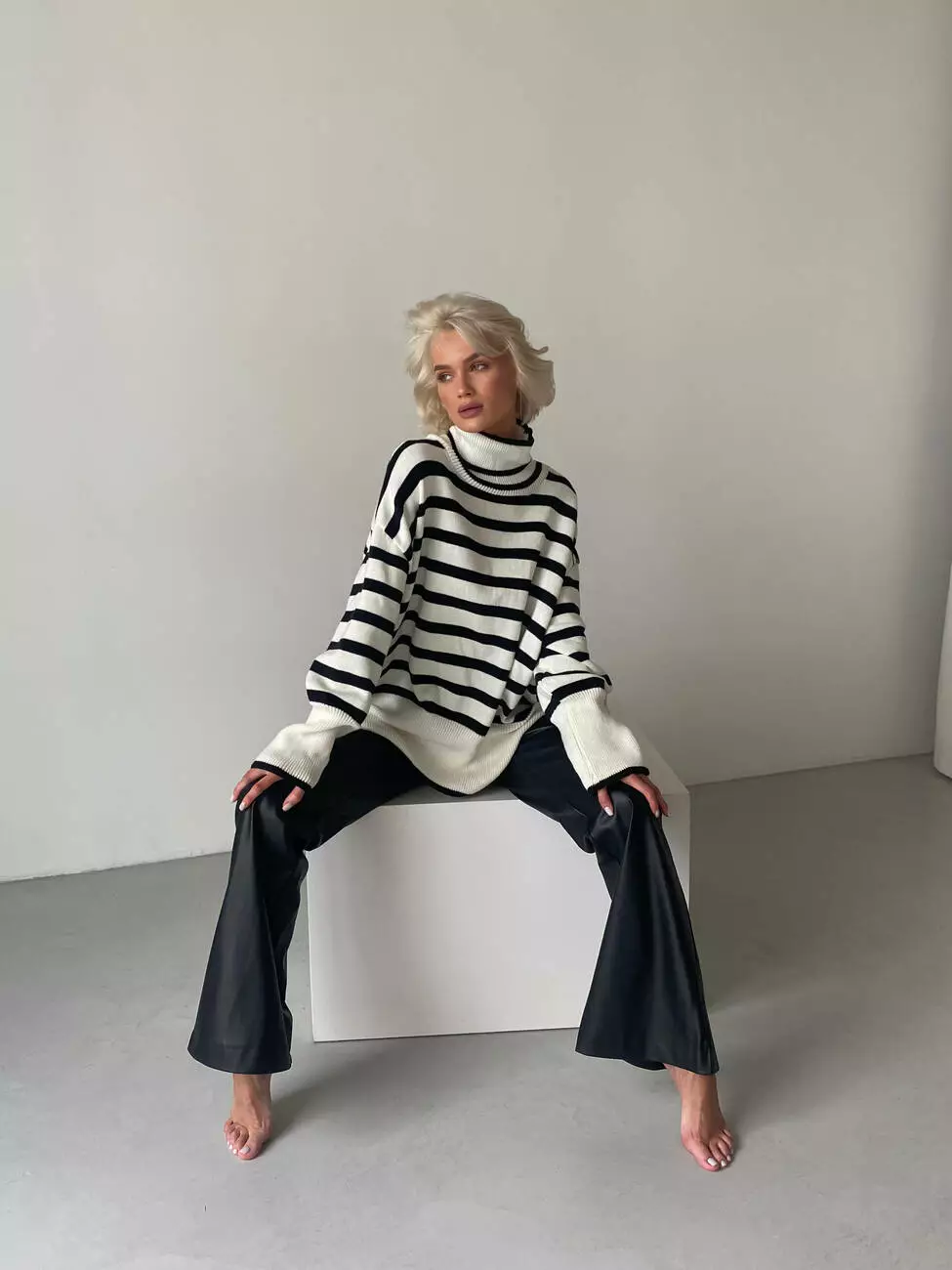 Модель має високу посадку з двома робочими кишенями, клешені, вільні штани (не в обліпку), а клеш йде від коліна.