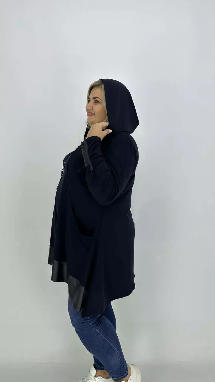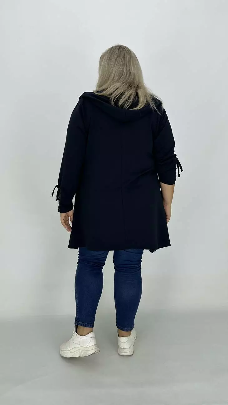 Силует трапеція, крій вільний, довжина рукава регулюється стяжкою, кишені у рельєфних швах, з капюшоном.