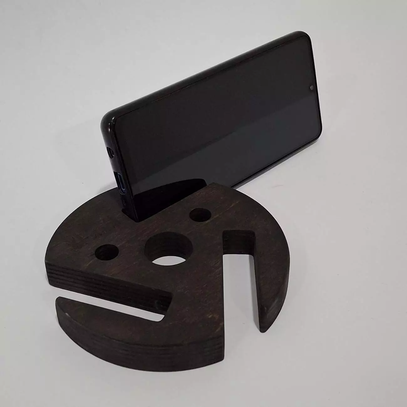 Тримач виконаний з натуральної вологостійкої фанери, товщиною 18мм. Має ергономічну форму, яка дозволить розташувати Ваш гаджет в будь-якому зручному положенні. Має декілька фіксуючих положень, дозволяє розміщувати телефон як горизонтально так і вертикально.