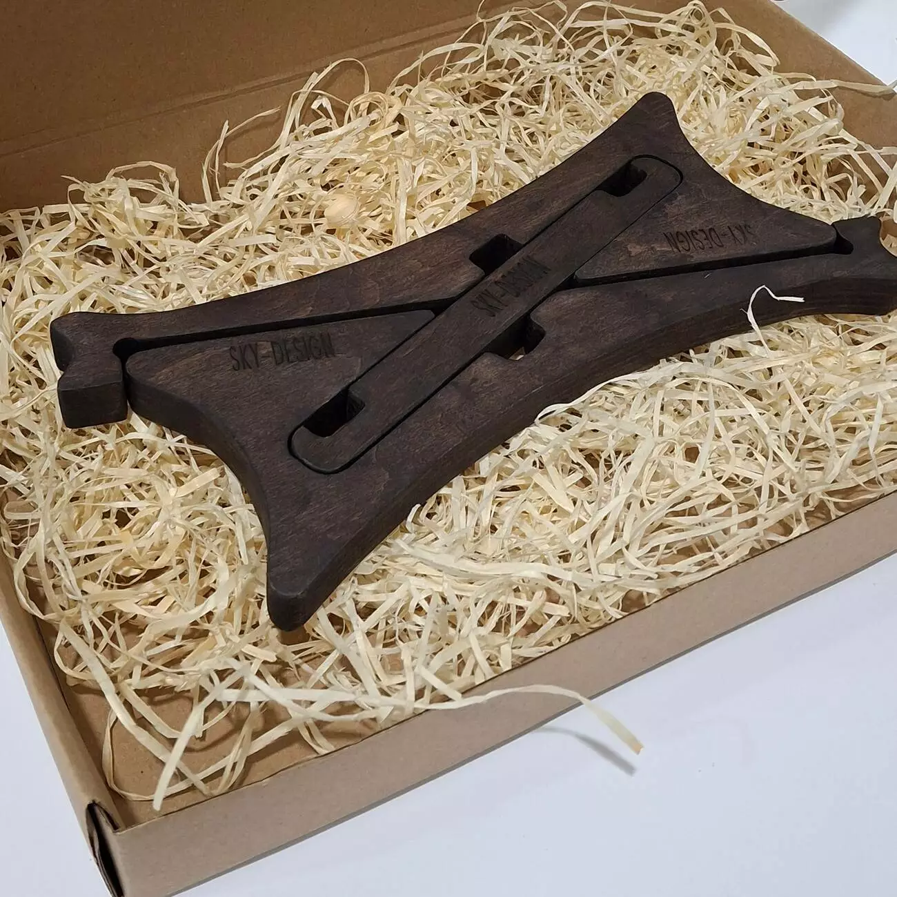 Тримач виконаний з натуральної вологостійкої фанери, товщиною 18мм. Має ергономічну форму, яка дозволить розташувати Ваш гаджет в будь-якому зручному положенні. Тримач потрібен для зручності роботи, також створює пространство між ноутбуком на поверхнею для кращого охолодження.