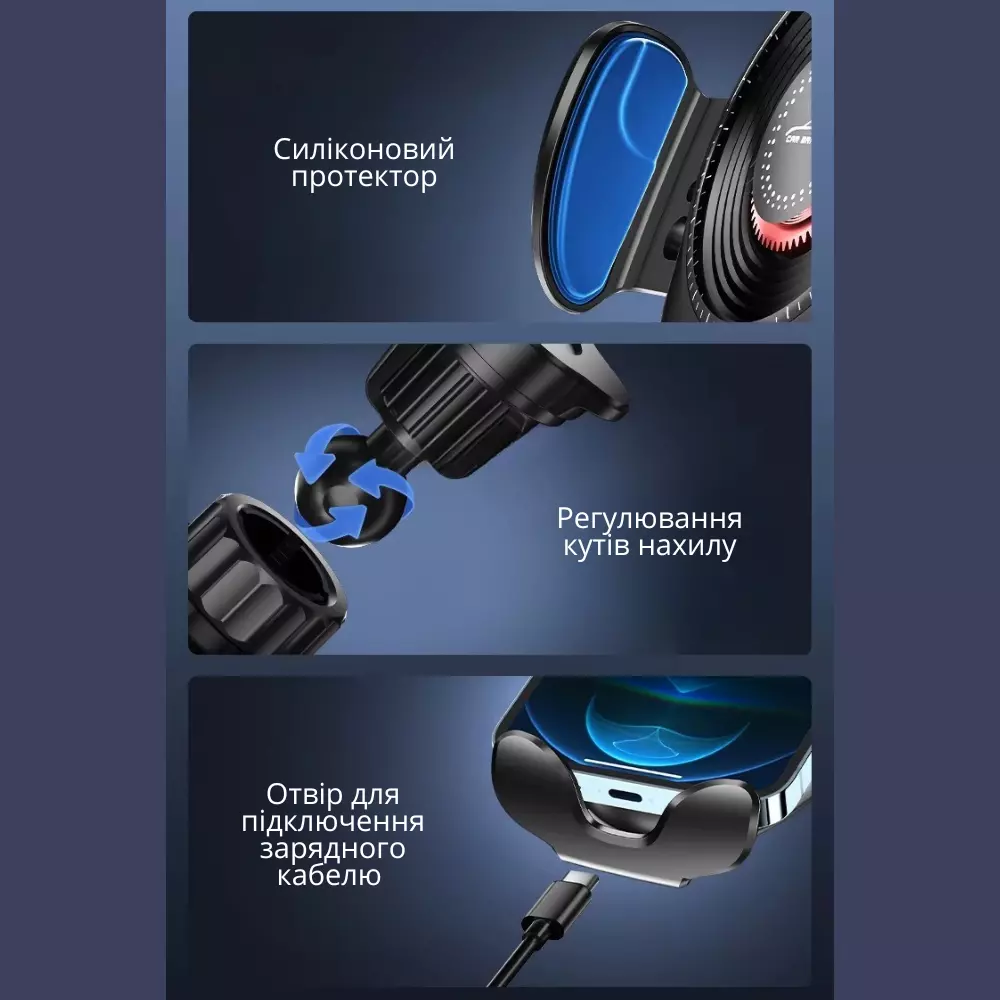 Автомобільний тримач з механічним фіксатором-зручний і надійний пристрій для безпечного використання смартфона в дорозі. Завдяки системі механічного блокування тримач забезпечує міцну фіксацію телефону без вібрацій і зсувів.