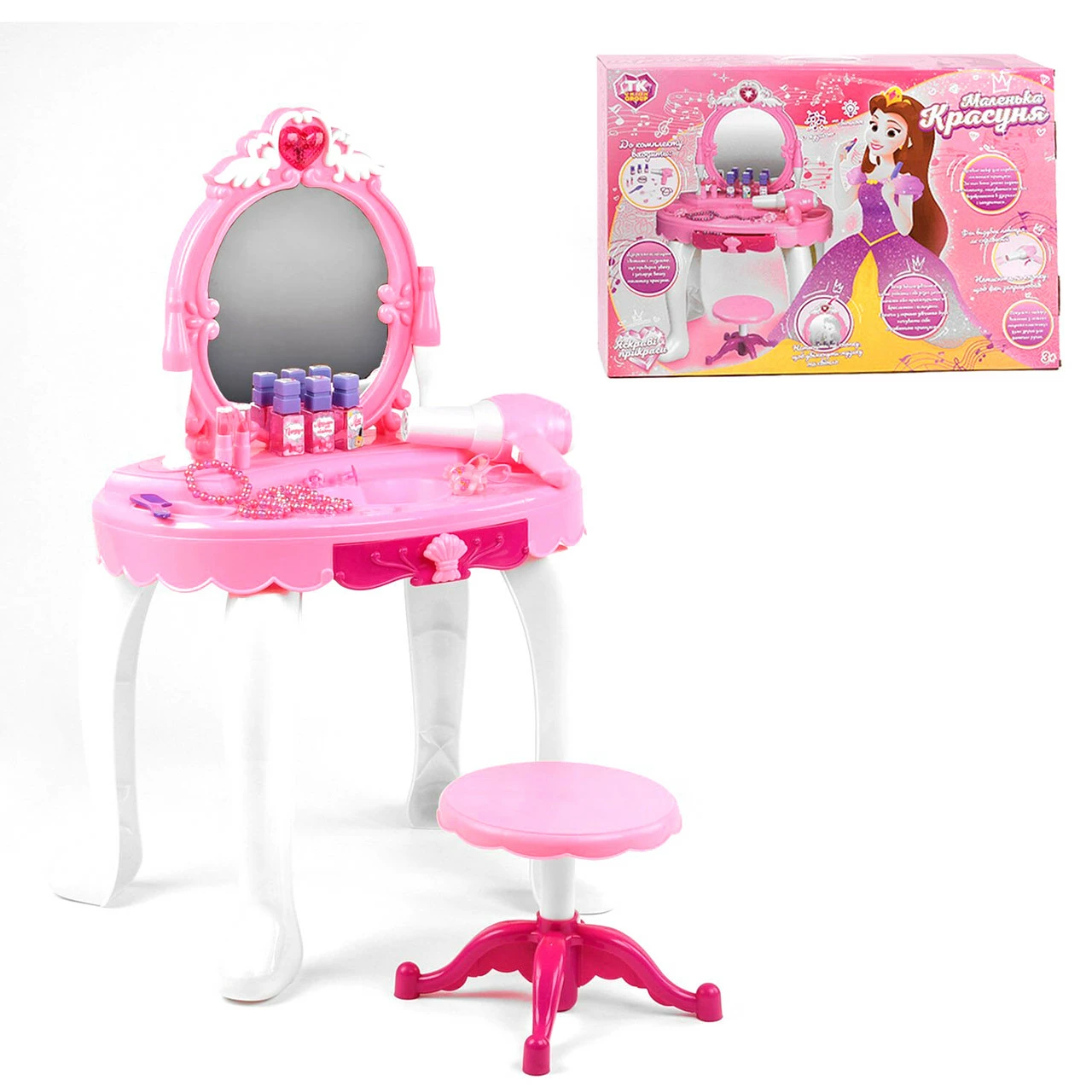 Большое игровое трюмо дополнено удобным стульчиком, стильными