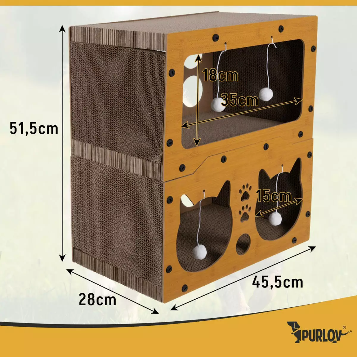 Двоповерховий драпак-будиночок Purlov — це комфорт і активність для кота та спокій для ваших меблів. Жорсткий HDF-каркас забезпечує стабільність, а натуральна гофрована поверхня спрямовує інстинкт дряпання на драпак. У комплекті — 4 м’ячики для щоденних ігор.
