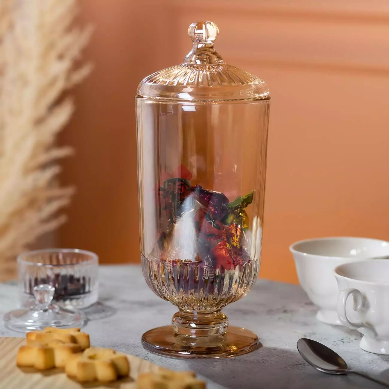 Скляна конструкція цукерниці гарантує легкий догляд і тривалий термін служби. Вона стане не лише стильним елементом декору, а й чудовим подарунком для близьких, додаючи елегантності будь-якому дому.