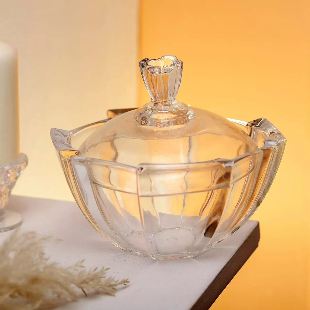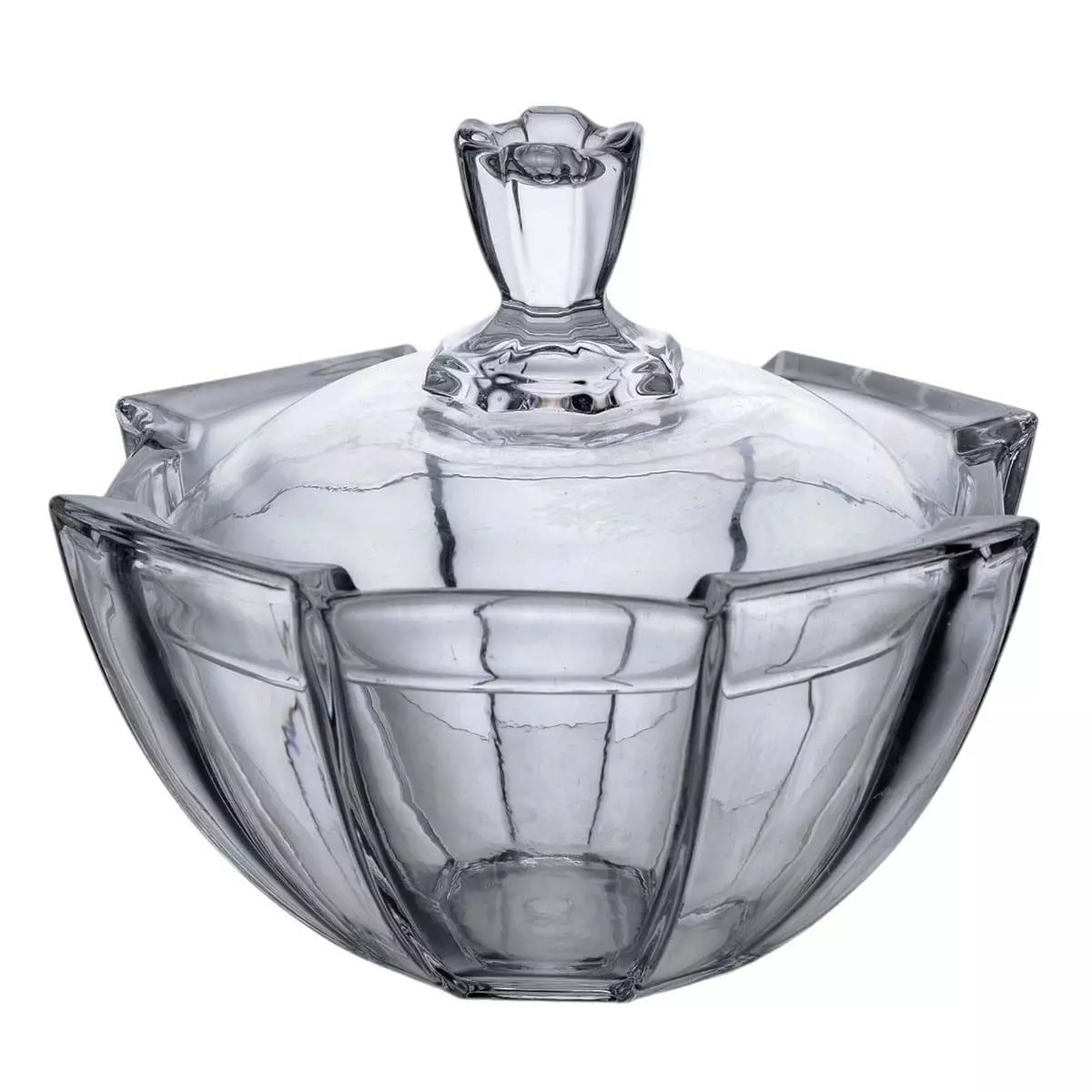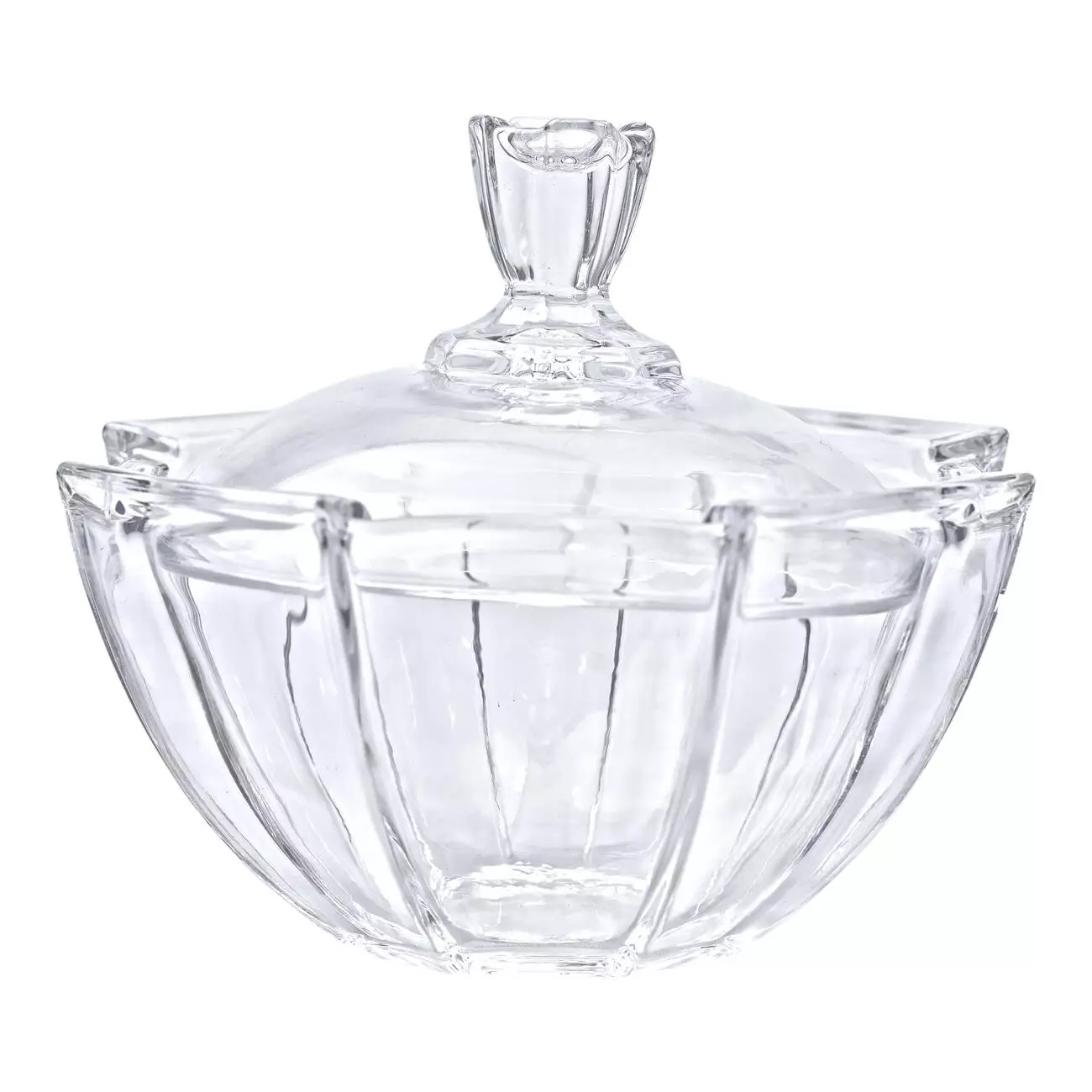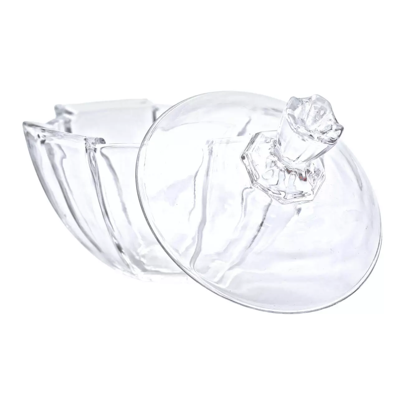 Цукорниця Danny Home виготовлена з товстого прозорого скла та має округлу форму з широким діаметром. Виріб обладнано щільною скляною кришкою з масивною ручкою, яка зручно лягає в руку. Завдяки поєднанню товстих стінок і значної ваги (1,2 кілограма), посудина стійка та добре тримається на поверхні.