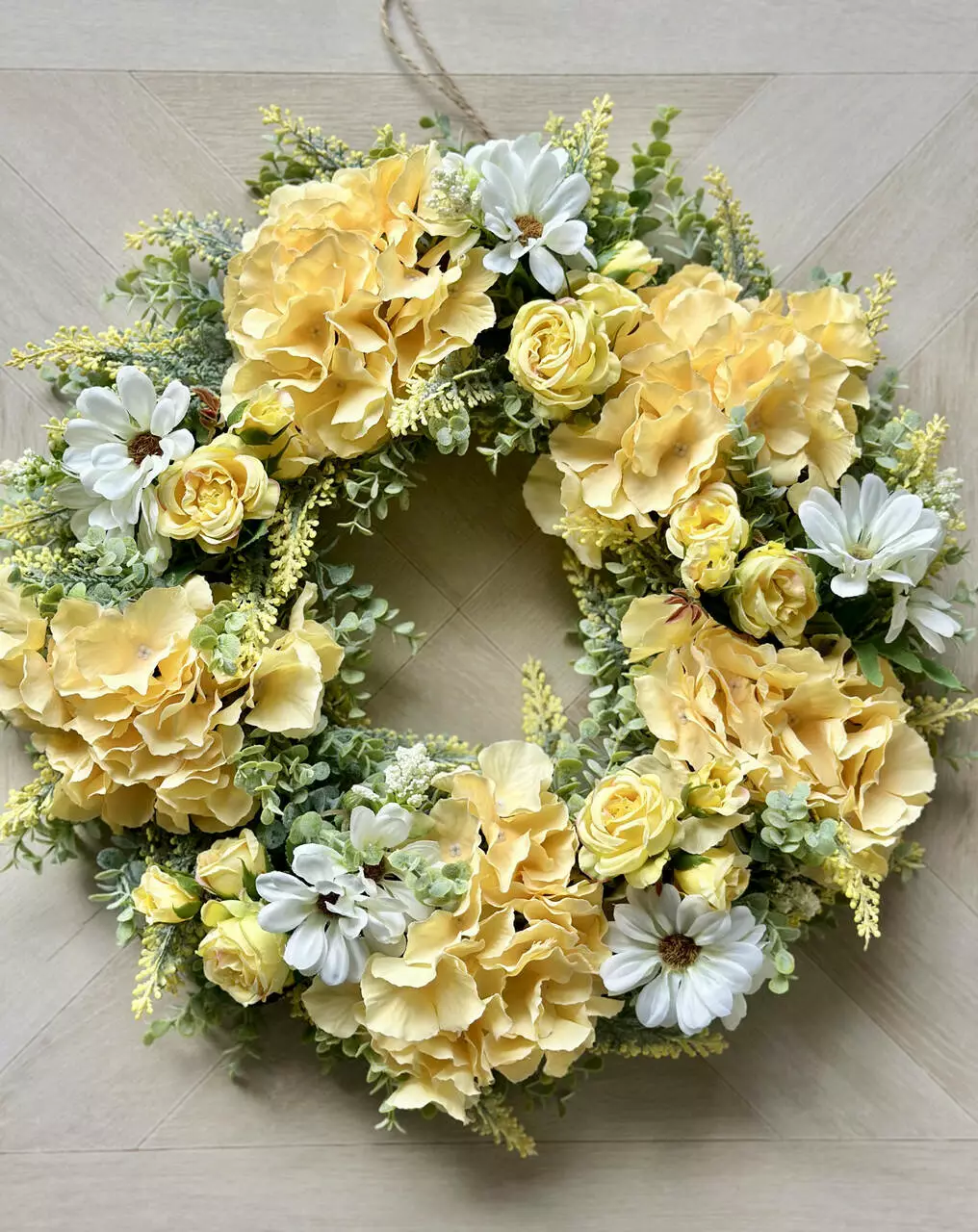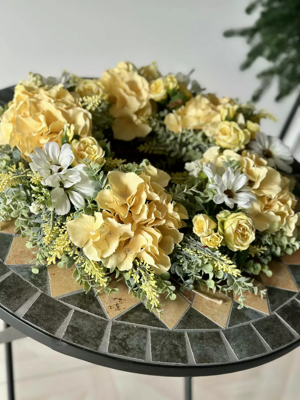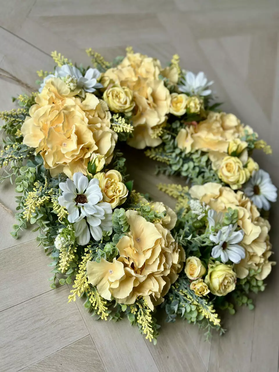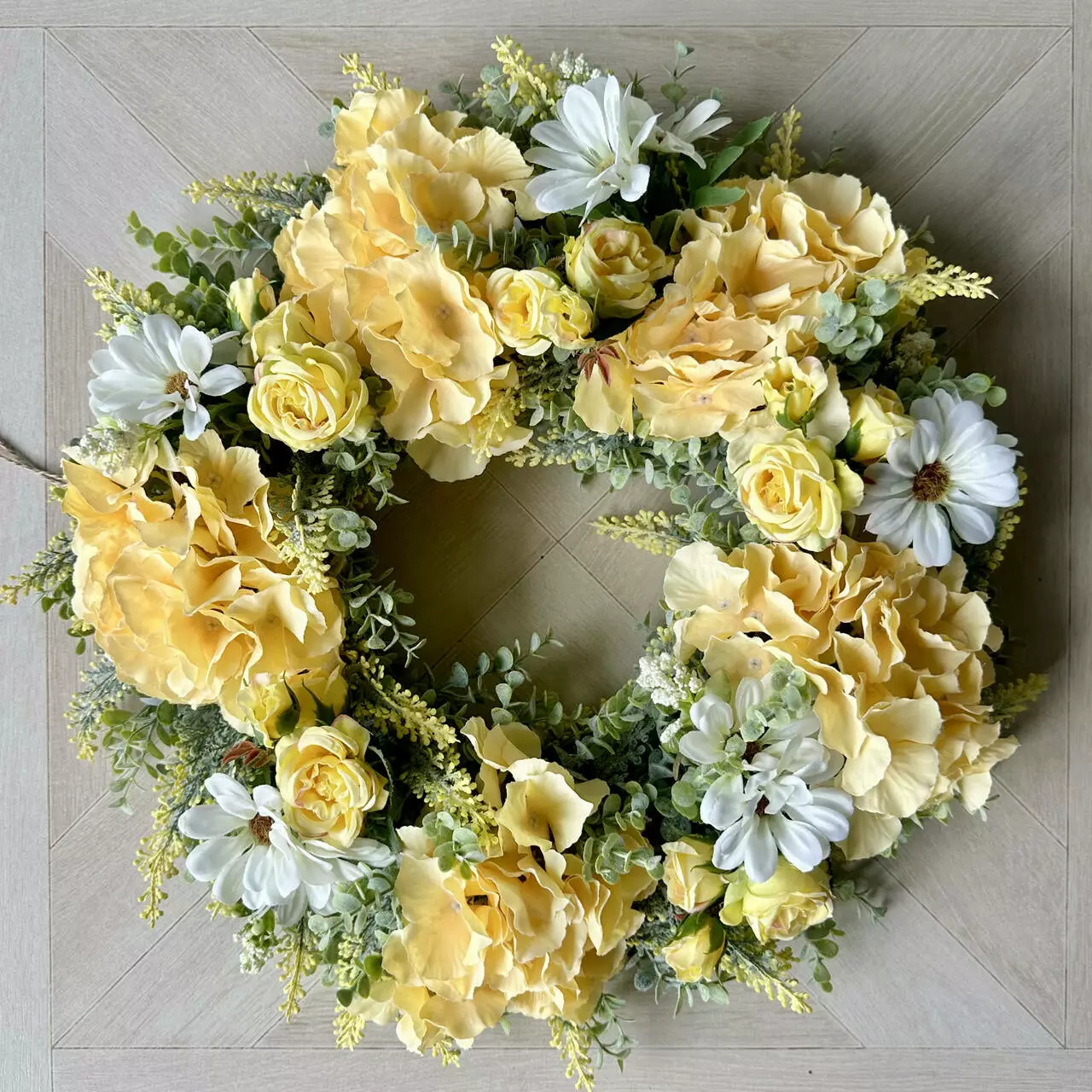 Сочетание пышной гортензии, жёлтых роз, белых хризантем и