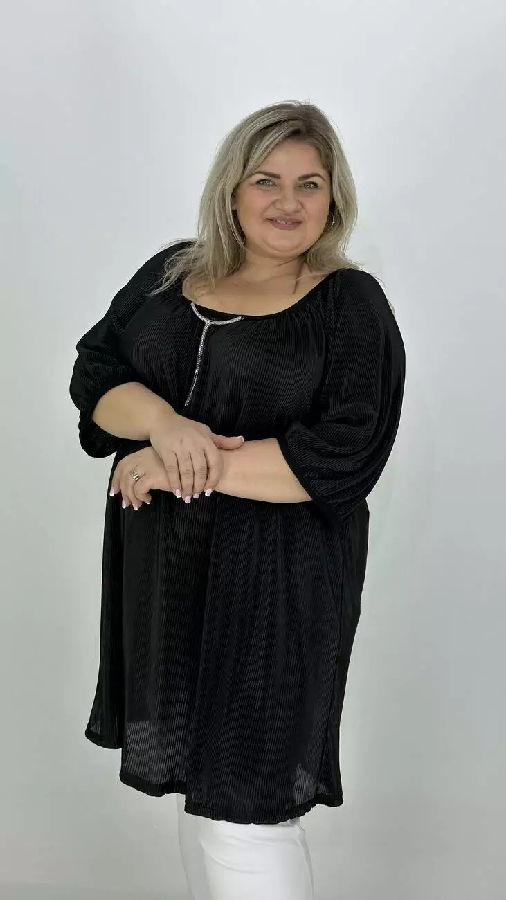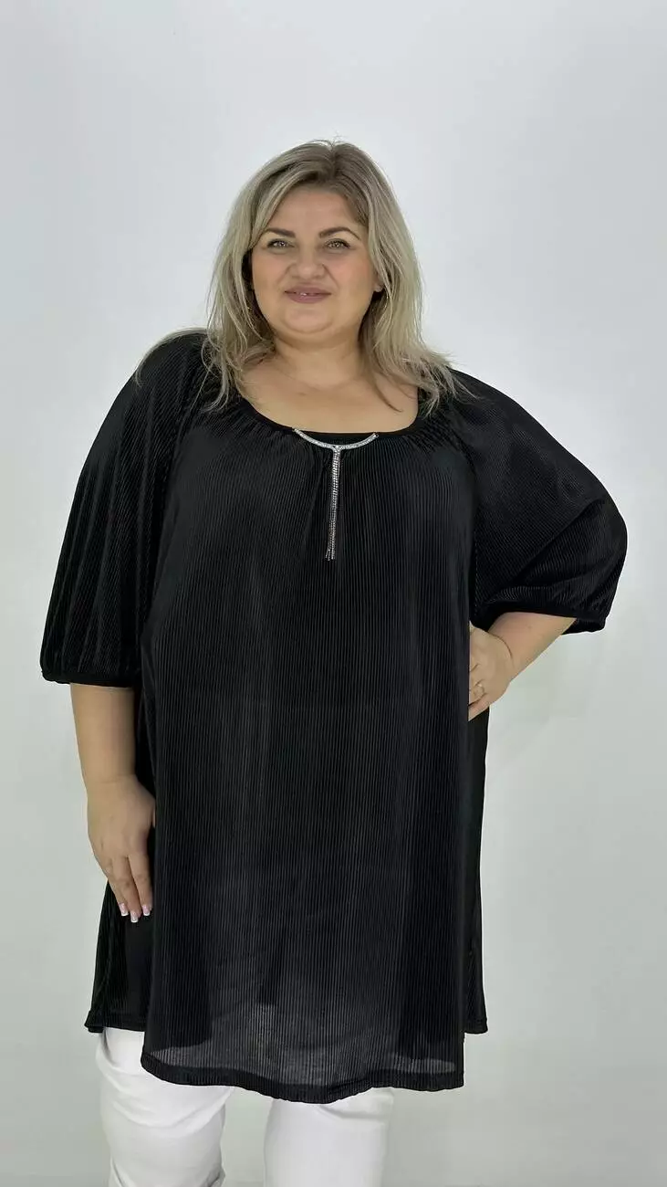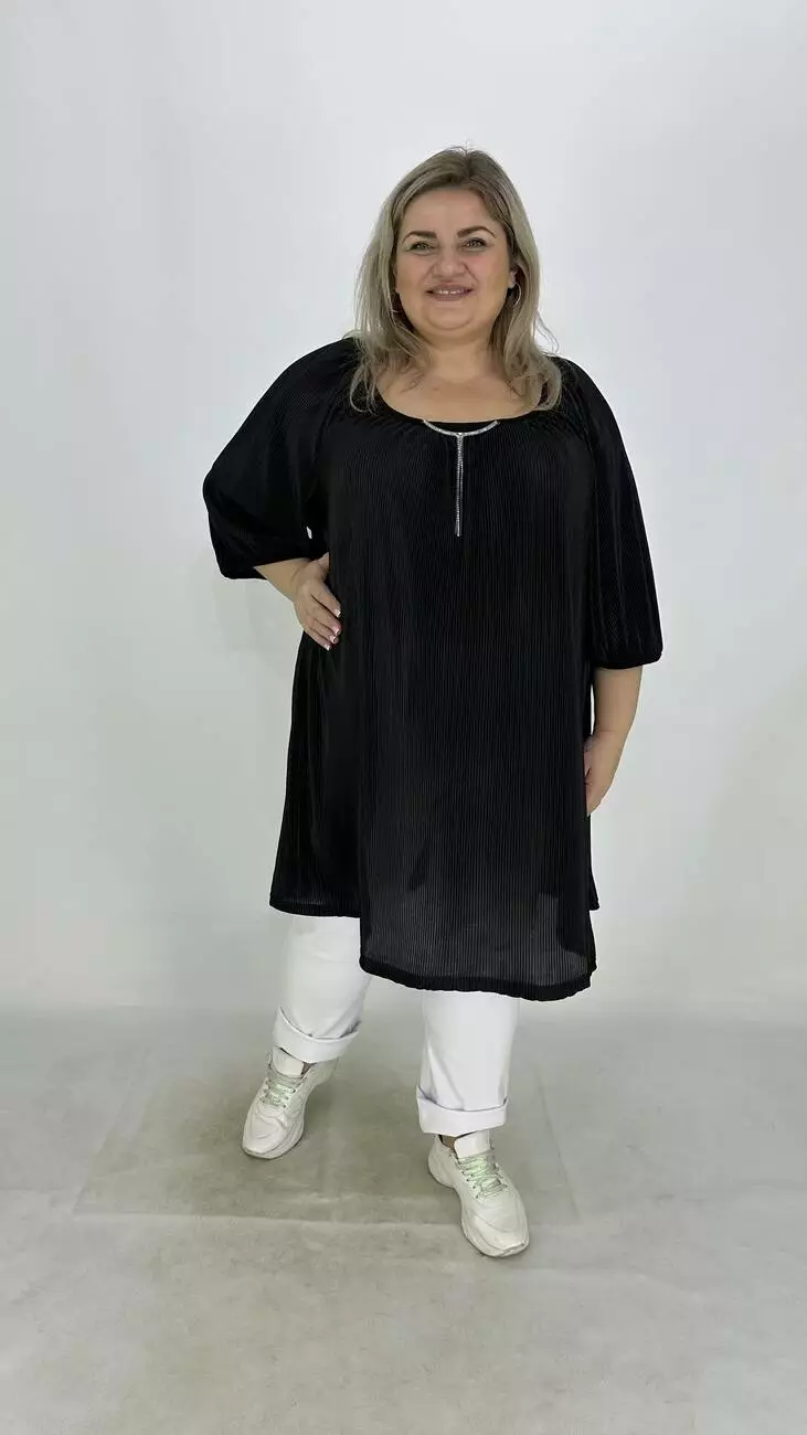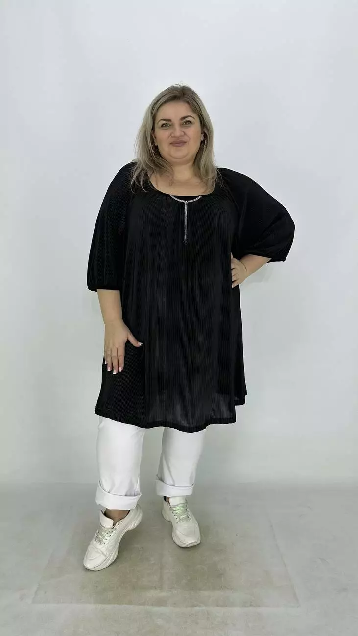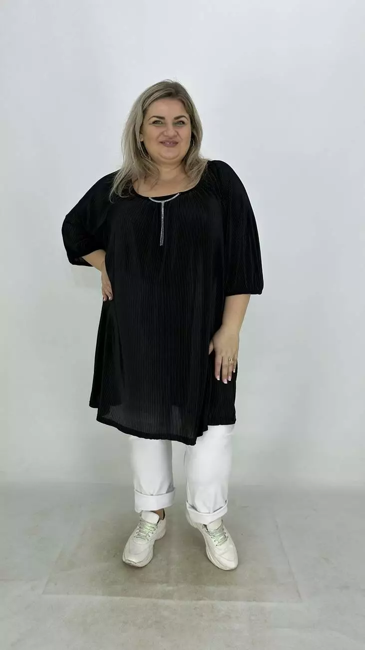 Вільна туніка із гофрованого трикотажу. Дуже хороша розтяжність, не меніться, не потребує особливого догляду. Силует трапеція, рукав реглан, горловина прилаштована та прикрашена пришевним кольє з камінням.