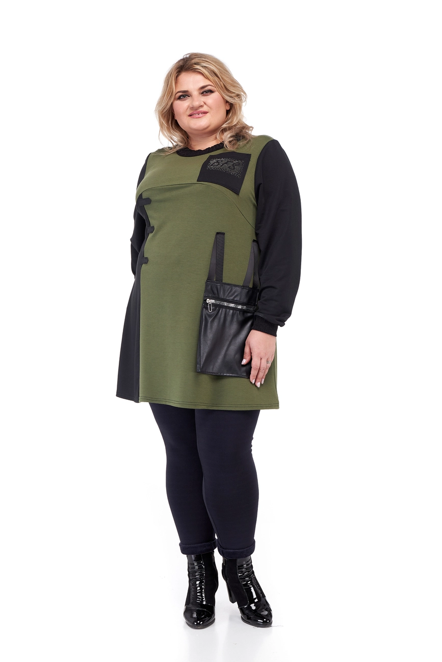 Тканина: двонитка - 47% бавовна; 3% еластан; 50% поліестер. Стильна туніка вільного силуету. Рукави довгі з манжетами, горловина кругла, виріб має пришивну велику кишеню та пришивну прикрасу в стразах. Розміри : 62-64 ог-132 от-132 об-146 дв-91 шр-48 др-61; 66-68 ог-140 от-140 об-150 дв-91 шр-52 др-61; 70-72 ог-150 от-150 об-160 дв-91 шр-54 др-61