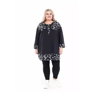 Тканина: двонитка - 47% бавовна, 50% поліестер, 3% еластан. Туніка-сорочка з трикотажу двонитка середньої щільності з гарною розтяжністю, дуже м'яка і приємна до тіла. Силует вільний А-подібний, спущене плече, рукав широкий 5/6 з манжетом. Планка декоративна не розтігується, прикрашена клейовими камінцями. Рекомендується прати вручну при температурі 30 градусів. Розміри :