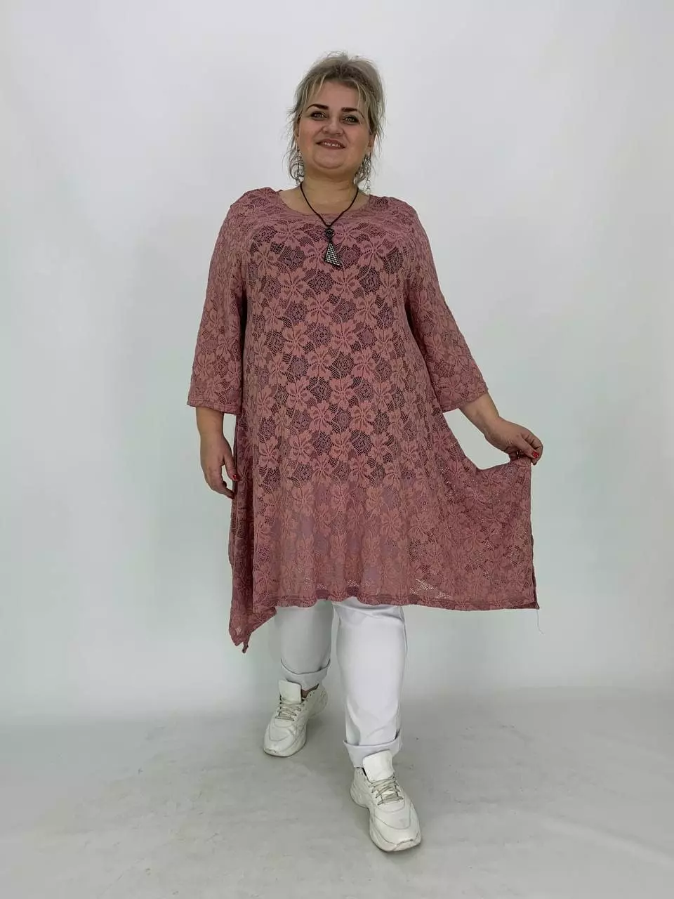 Тканина: масло - ​​70% поліестер, 20% віскоза, 10% еластан і гофре - 100% поліестер. Майка чорного або темно-синього кольору. Туніка+майка. ТУНІКА із гофрованої сітки з вибитим орнаментом по низу. М'яка, добре тягнеться, має форму. Силует вільний з широкими подовженими боками, прикрашений мереживом по горловині. Майка подовжена з віскози, дуже м'яка та приємна до тіла. Відмінно розтягується, горловина та пройми відпрацьовані равликом. Не мнеться, не вимагає особливого догляду, під праскою гофре не розгладжується (режим-капрон). Розміри :