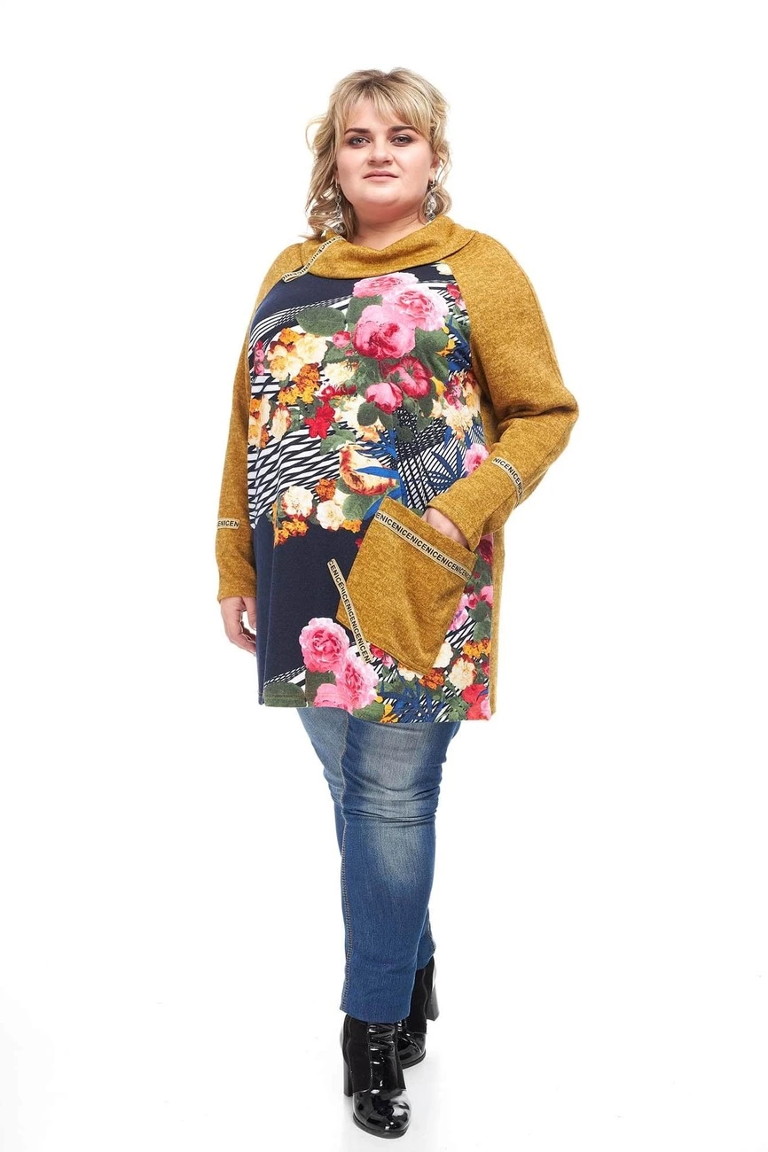 Тканина: ангора софт-80% поліестер; 15% віскоза; 5% еластан, ангора-30% бавовна; 40% віскоза; 30% поліестер.Красива, тепла туніка з тканини ангора софт. Туніка напівприлеглого силуету з довгим рукавом, горловина кругла - хомутом. Виріб має одну велику накладну, функціональну кишеню.Спинка однотонна.
