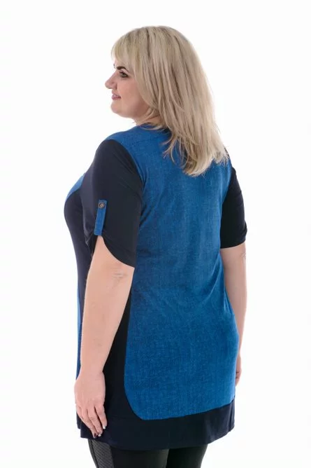 Тканина: масло-70% поліестер; 20% віскоза; 10% еластан. Стильна туніка напівприлеглого силуету. Рукав короткий, з хлястиком. Біля горловини блискавка, малюнок виробу прикрашений стразами. Тканина добре розтяжна, не потребує особливого догляду. Розміри :