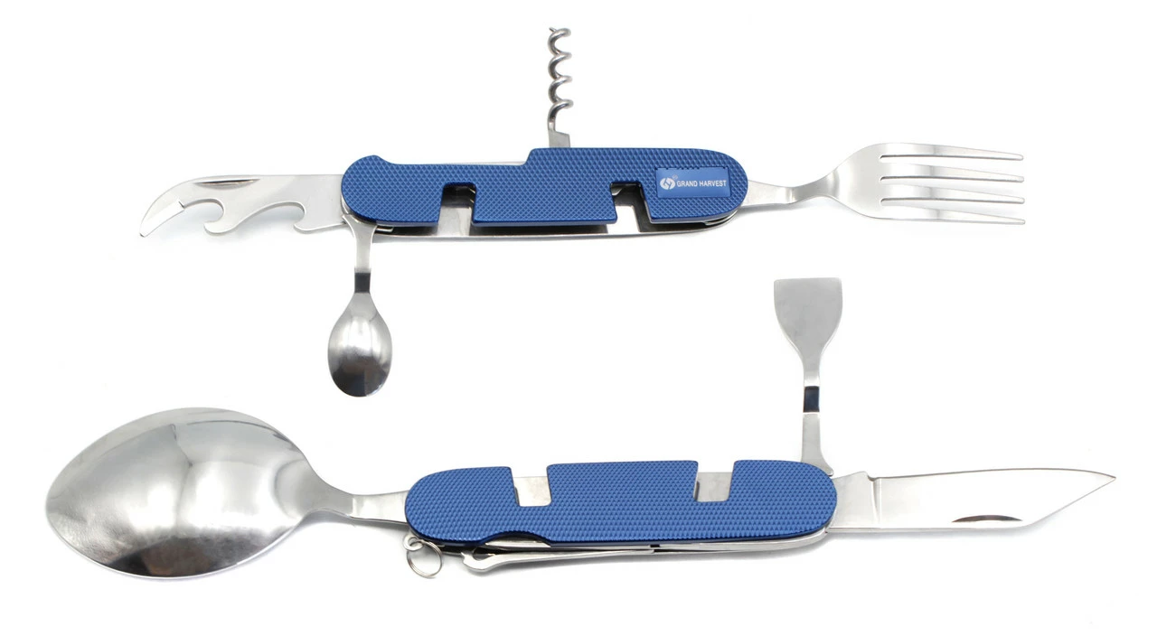 Мультитул имеет ложку, вилку, ложку, чайную ложку и другие полезные штучки. Достаточно прочный мультитул. Отпускается оптом.