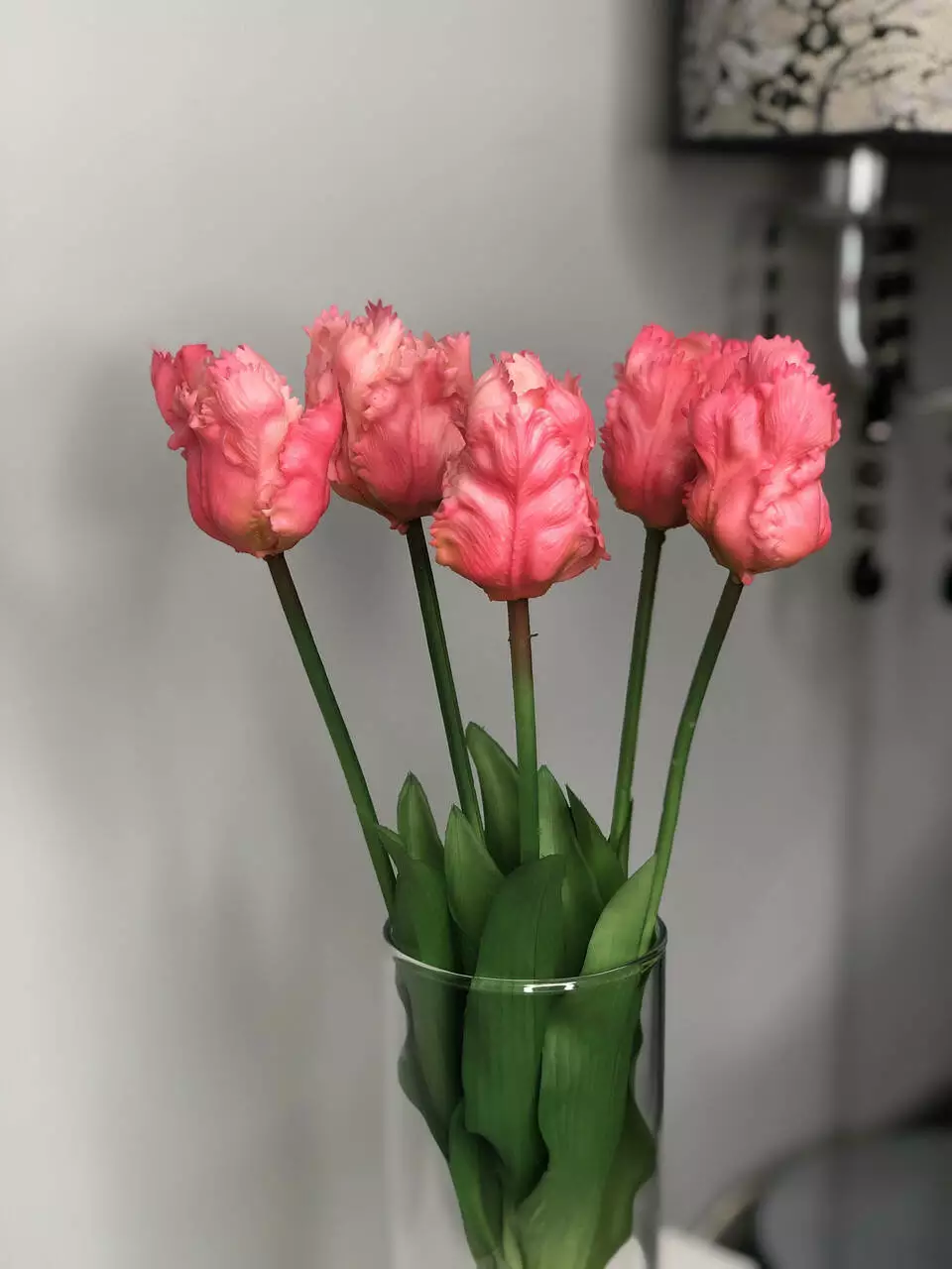 Букет состоит из 5 розовых тюльпанов. Каждый цветок имеет диаметр 4 см, а общая высота букета составляет 41 см. Изящные махровые лепестки придают композиции особую элегантность и нежность. Стебли и листья имеют естественный зелёный оттенок и выполнены с вниманием к деталям, что делает их максимально натуральными.