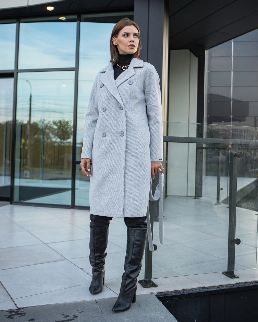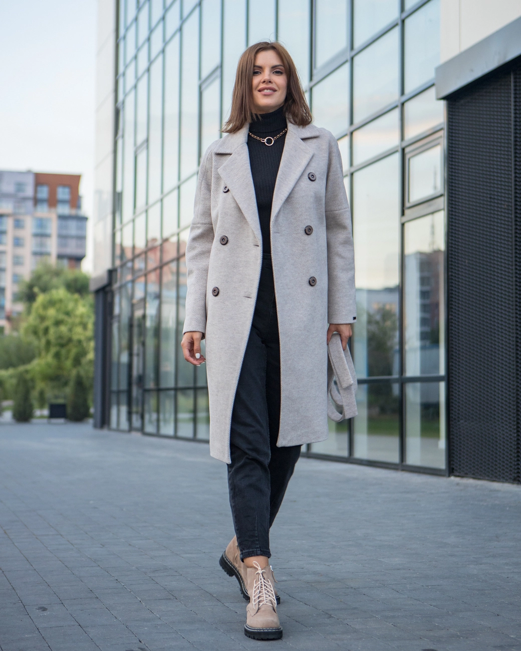 Удлиненное двубортное женское пальто в колено полуприталенного