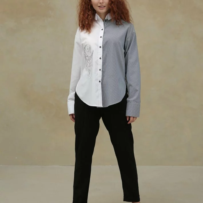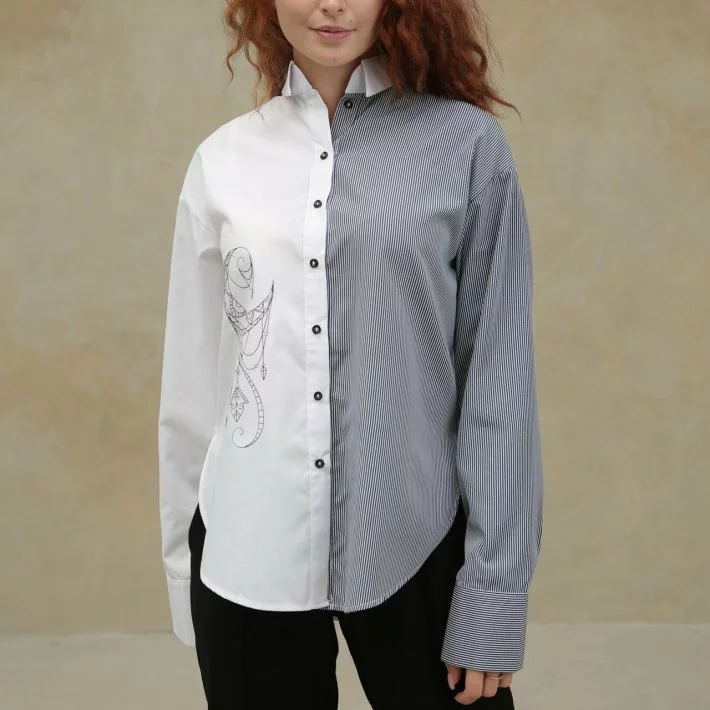 Сорочка з асиметрією за кольором: одна половина біла, з вишивкою