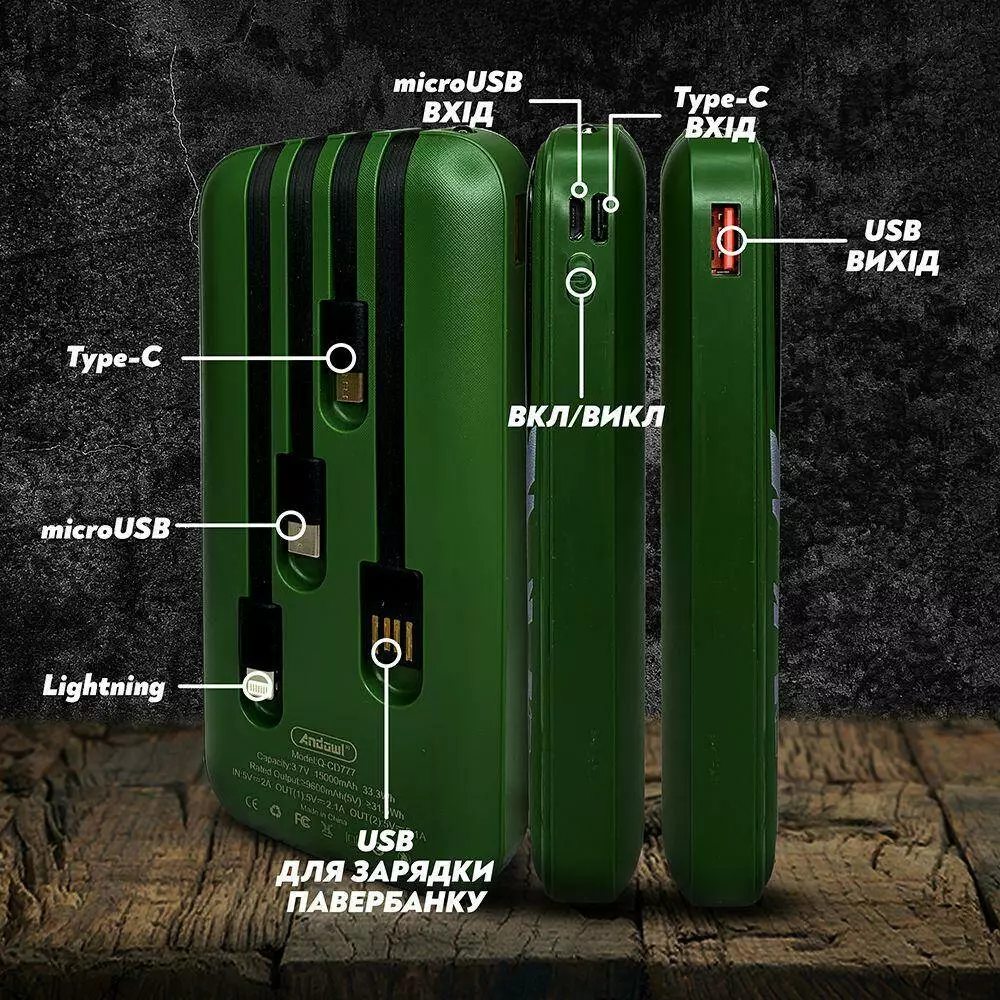 Универсальная мобильная батарея Andowl Q-CD777 емкостью 15000 mAh совместима со всеми современными смартфонами и планшетами. Благодаря индикатору уровня заряда, вы всегда будете знать, сколько энергии осталось в аккумуляторе. Также Andowl Q-CD777 имеет встроенные кабели USB, Type-C, Lightning и microUSB благодаря чему все необходимые кабели зарядки будут всегда под рукой. Больше не беспокойтесь о том, что пропустите важные звонки или уведомления. С павербанком Andowl всегда достаточно энергии для смартфона или другого мобильного устройства.