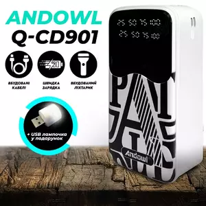 Портативная батарея Andowl Q-CD901 отличается стильным дизайном, высокой емкостью батареи и возможностью подключения нескольких устройств. Универсальная мобильная батарея Andowl Q-CD901 емкостью 40000 mAh совместима со всеми современными смартфонами и планшетами. Также УМБ Andowl Q-CD901 располагает наличием встроенных кабелей microUSB, USB Type C, USB Type A и Lightning с тыльной стороны устройства.