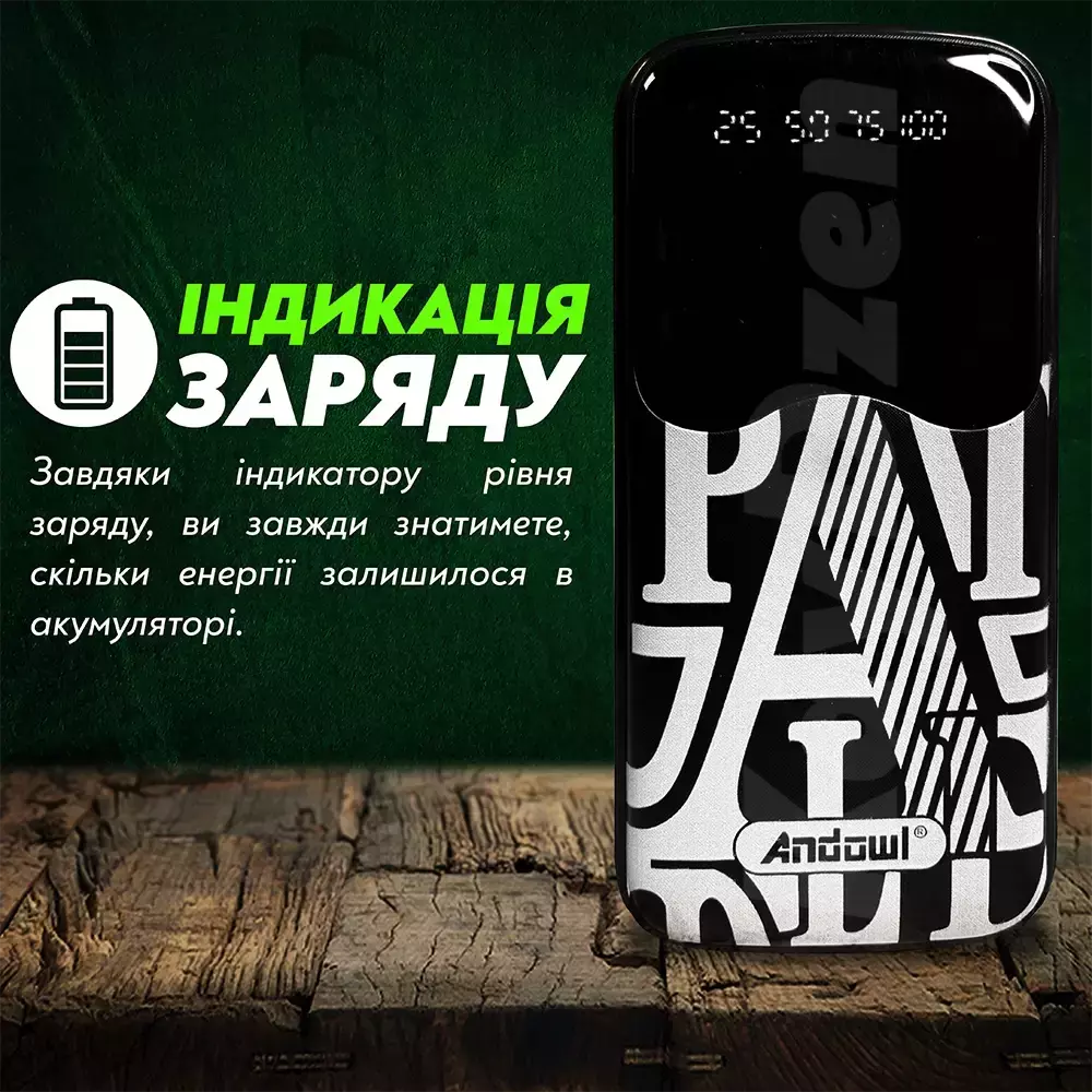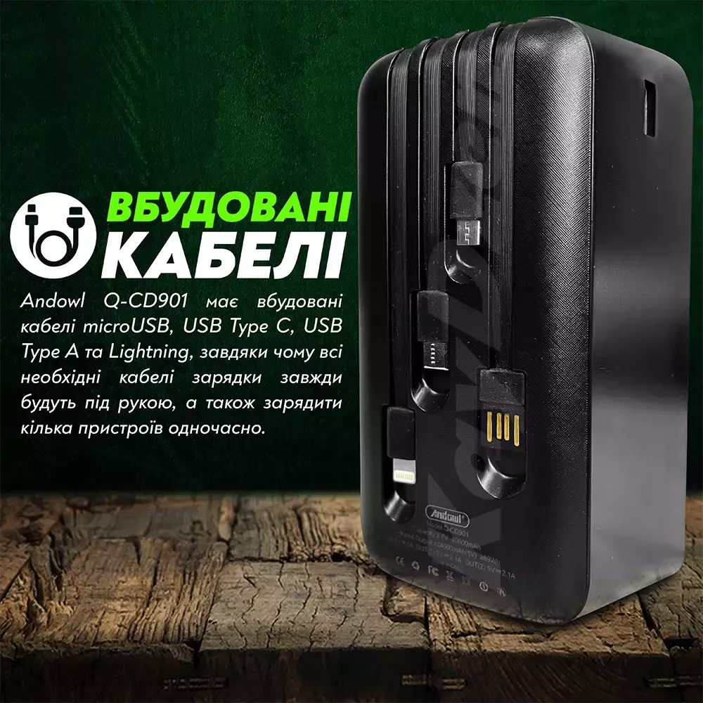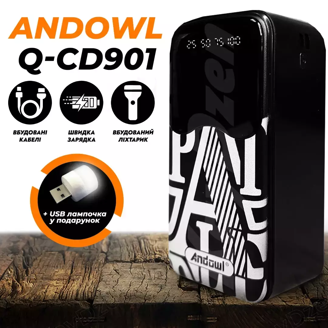 Портативная батарея Andowl Q-CD901 отличается стильным дизайном, высокой емкостью батареи и возможностью подключения нескольких устройств. Универсальная мобильная батарея Andowl Q-CD901 емкостью 40000 mAh совместима со всеми современными смартфонами и планшетами. Также УМБ Andowl Q-CD901 располагает наличием встроенных кабелей microUSB, USB Type C, USB Type A и Lightning с тыльной стороны устройства. Особенности: Встроенные кабели. Andowl Q-CD901 имеет встроенные кабели microUSB, USB Type C, USB Type A и Lightning, благодаря чему все необходимые кабели зарядки будут всегда под рукой, а также зарядить несколько устройств одновременно. Быстрая зарядка. УМБ поддерживает быструю зарядку устройств , с помощью которой Ваши устройства могут пополнять заряд еще быстрее. Индикатор заряда. Благодаря индикатору уровня заряда, вы всегда будете знать, сколько энергии осталось в аккумуляторе. Характеристики: Емкость аккумулятора: 40000 mAh Цвет: Черный Материал: Пластик LED дисплей