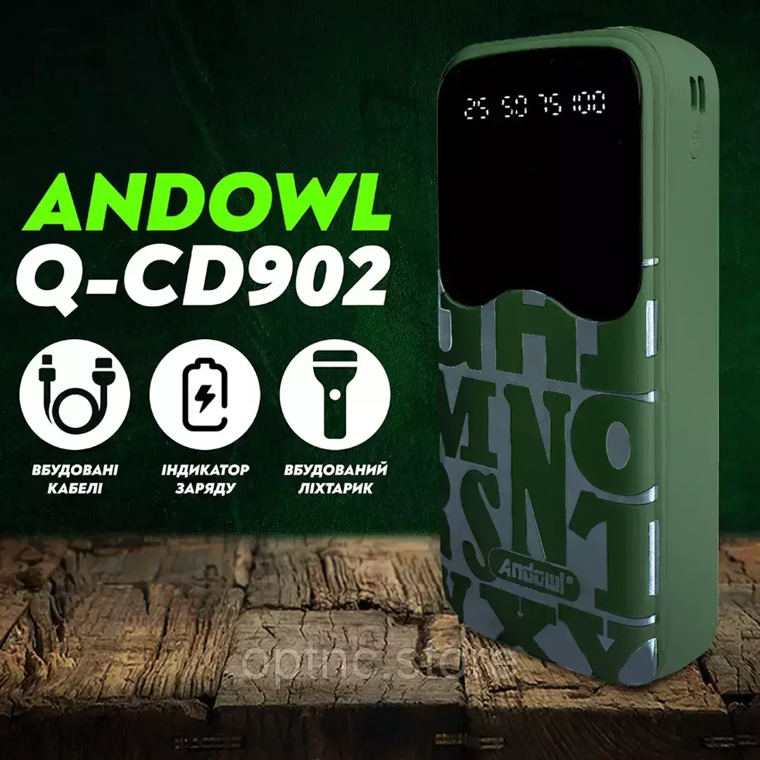 Портативная батарея Andowl Q-CD902 отличается стильным дизайном, высокой емкостью батареи и возможностью подключения нескольких устройств. Универсальная мобильная батарея Andowl Q-CD902 емкостью 30000 mAh совместима со всеми современными смартфонами и планшетами. Также УМБ Andowl Q-CD902  располагает наличием встроенных кабелей microUSB, USB Type C, USB Type A и Lightning с тыльной стороны устройства.